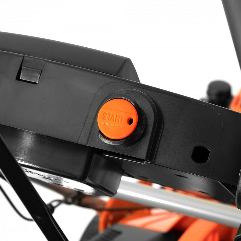 - E-START 20 Volt. Запуск двигателя можно осуществить путем нажатия кнопки Start. Питание от аккумулятора 20 В, который входит в комплектацию вместе с зарядным устройством.