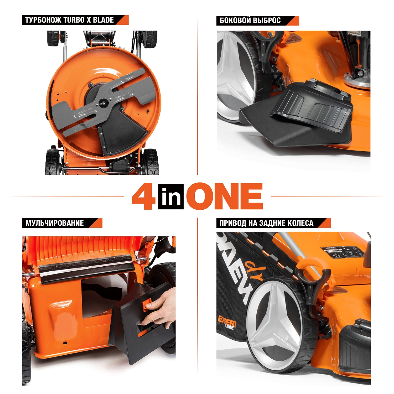 - Функции 4-в-1. Кошение, сбор травы в травосборник, боковой выброс и мульчирование. Конструкция газонокосилки и нож TURBO X BLADE позволяют быстро менять режим работы без использования инструментов и замены ножа, обеспечивая удобное решение любых задач по уходу за газоном.