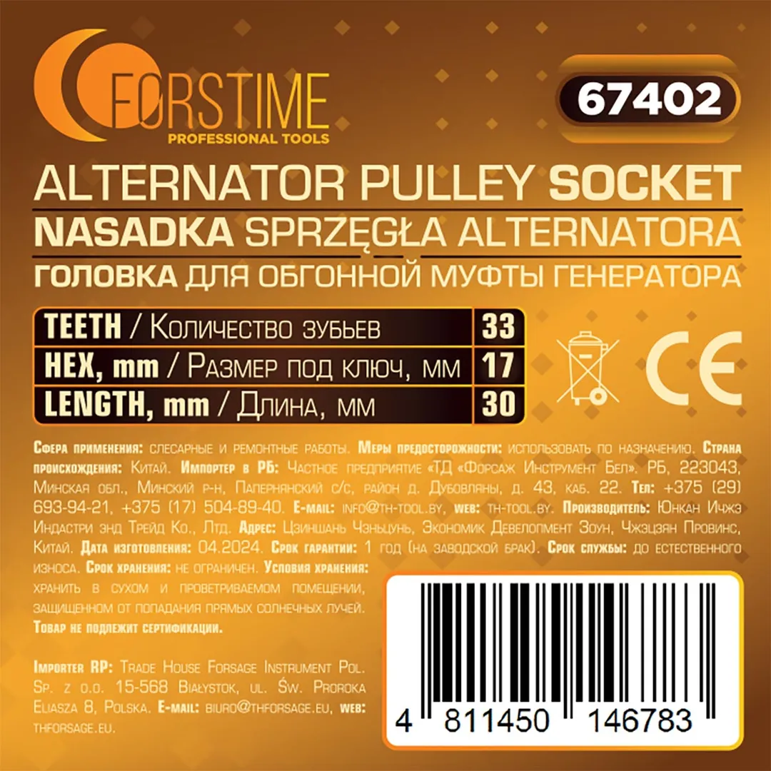 Головка для обгонной муфты генератора 30 мм FORSTIME FT-67402, описание и характеристики:
