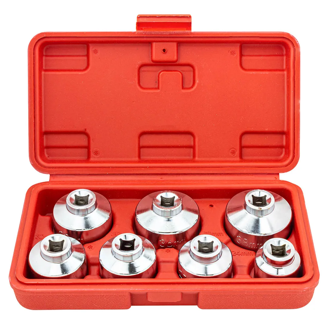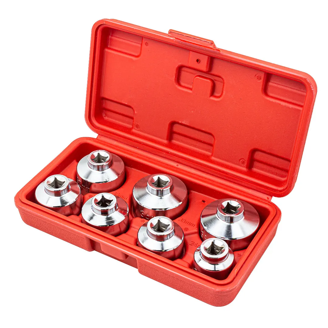 Набор съемников масляного фильтра 7 предметов. Замена масла и масляного фильтра станет намного проще с новым набором чашек масляного фильтра, 7 предметов - широкий диапазон размеров, подходящих для большинства автомобилей. Низкопрофильные крышки позволяет легко добраться до корпуса масляного фильтра даже в ограниченном пространстве и легко снять масляный фильтр. Применяются на СТО, в мастерских и гаражах. Комплектация: съемники 7 шт., кейс. Размеры головок 3/8" : 24, 27, 29, 30, 32, 36, 38мм Для удобства хранения и транспортировки поставляется в прочном пластиковом кейсе.Преимущества работы с нами