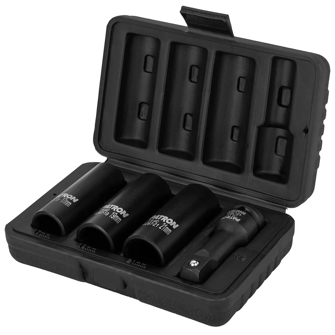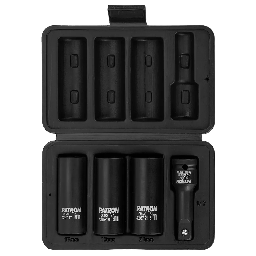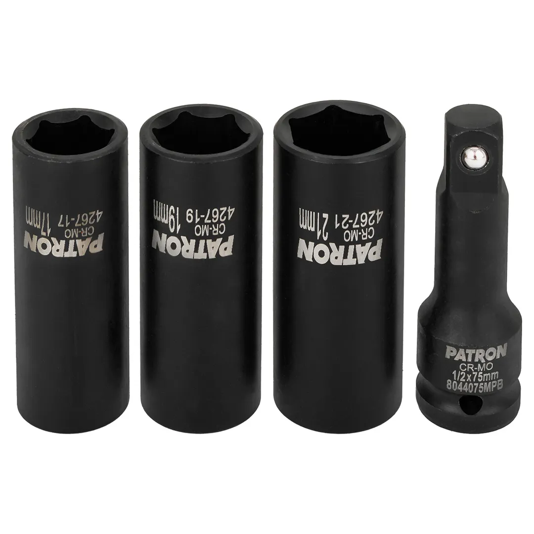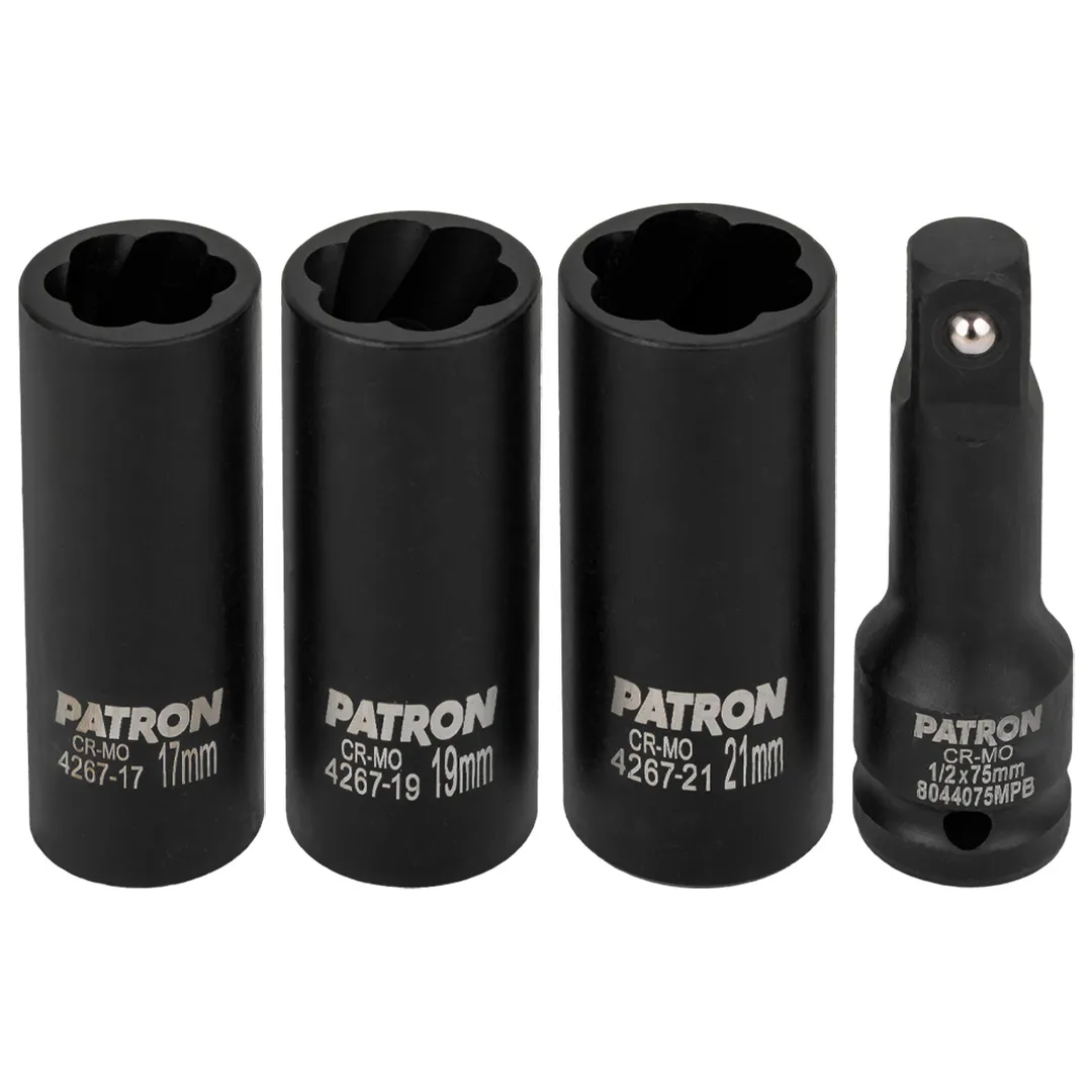 Набор ударных двухсторонних головок экстрактор/6-гр, с удлинителем 17, 19, 21 мм 1/2'' 4 пр PATRON P-4267