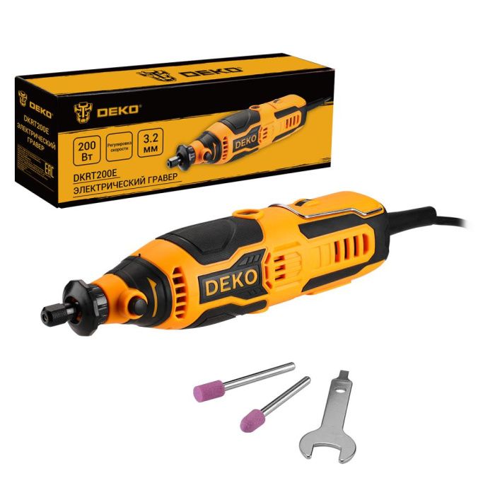 - Электрический гравер с регулировкой скорости 200Вт Deko DKRT200E идеально подходит для шлифования и полировки небольших поверхностей благодаря регулировке скорости и различным аксессуарам.