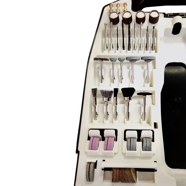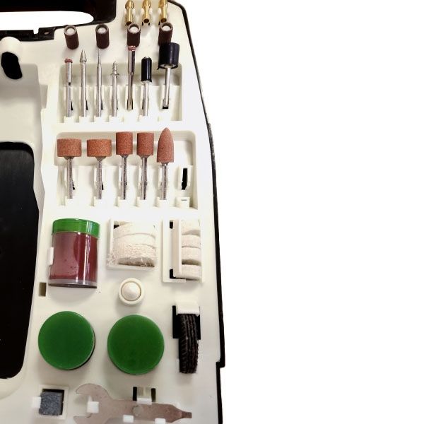 Набор сменных насадок из 234 предметов, позволяющий выполнять различные виды работ по шлифованию и резке.