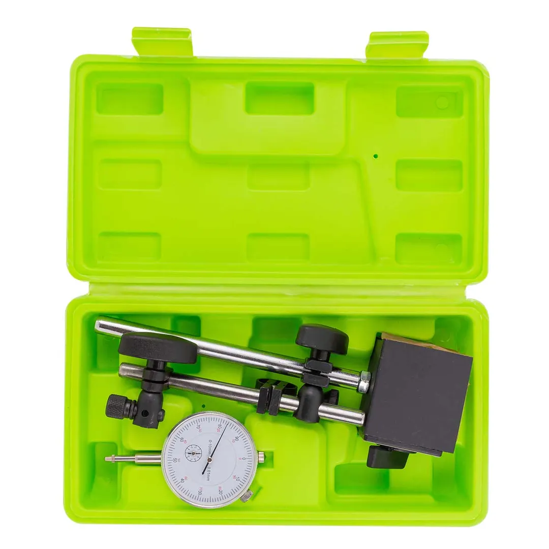 Индикатор часового типа – устройство для измерений и контроля отклонений от эталонной детали. Индикаторы без стойки не используют, так как опора придает дополнительную жесткость. Вам не надо покупать отдельно стойку, так как она идет в комплекте с индикатором. Стойку с магнитным основанием можно закреплять на горизонтальных, вертикальных или наклонных поверхностях для позиционирования измерительного устройства. Принцип действия действия часовых индикаторов основан на преобразовании линейного перемещения наконечника в соответственное перемещение стрелок циферблата. Индикатор широко применяется там, где необходим контроль горизонтальности и/или вертикальности положения плоскостей деталей, отклонения от плоскостности, параллельности, биения и т.д., служит для проверки качества в рамках стандартов и допусков на различных предприятиях – от автомобилестроения до частных мастерских. Диапазон измерений : 0 - 10 мм; Диаметр отверстия для крепления индикатора 4/8 мм; Размеры стойки d12 x 176 мм; Характеристика основания V-образное углубление; Вес : 2кг. Размеры основания 58 x 50 x 55 мм; Размеры измерительной руки d10 x 150 мм; Сила магнитного поля 600 N; Тип силы магнитного поля переключаемая; Размеры регулировочного винта M8 x 1.25; Цена деления 0,01 мм. Для удобного хранения и перемещения, товар укомплектован в прочный пластиковый кейс.Преимущества работы с нами
