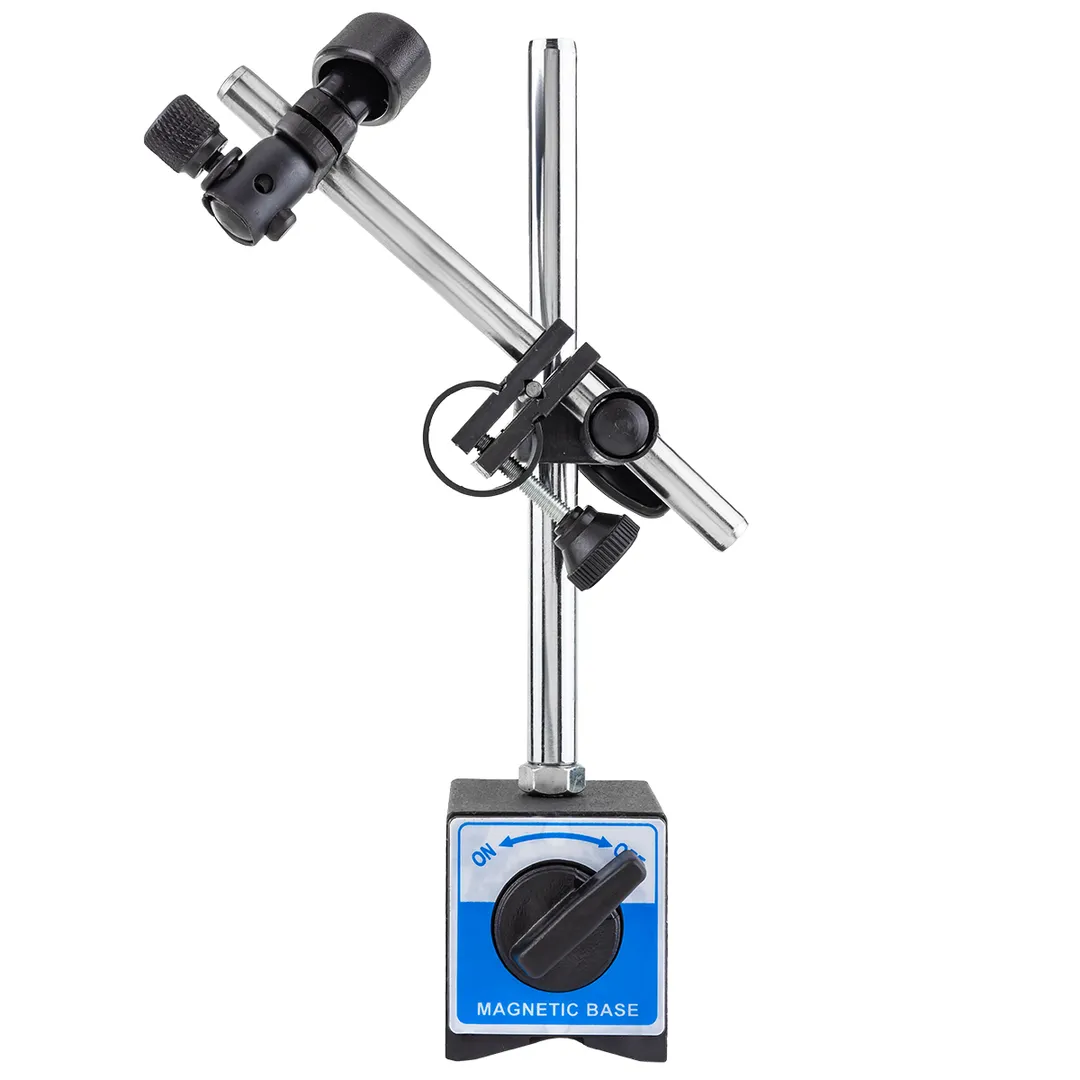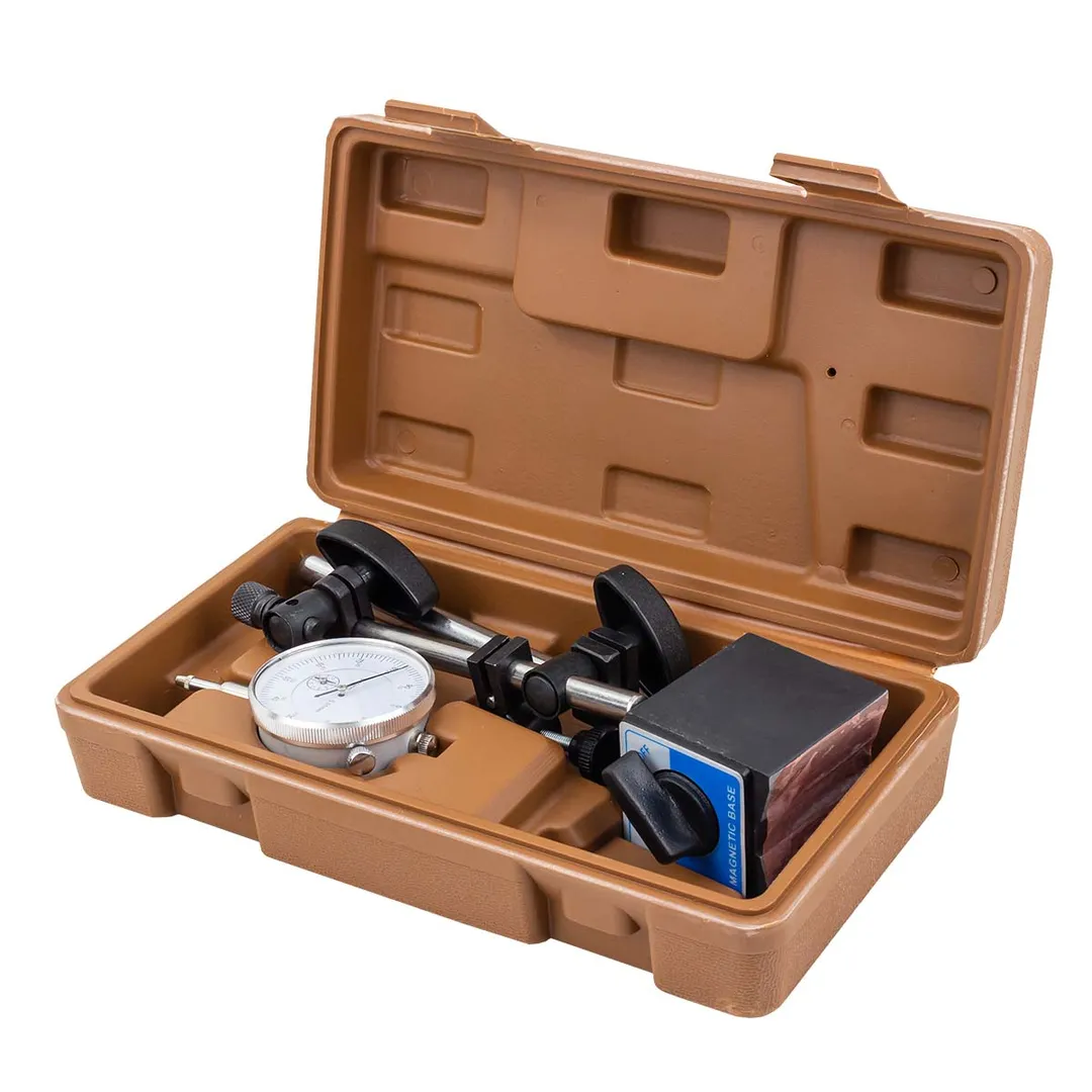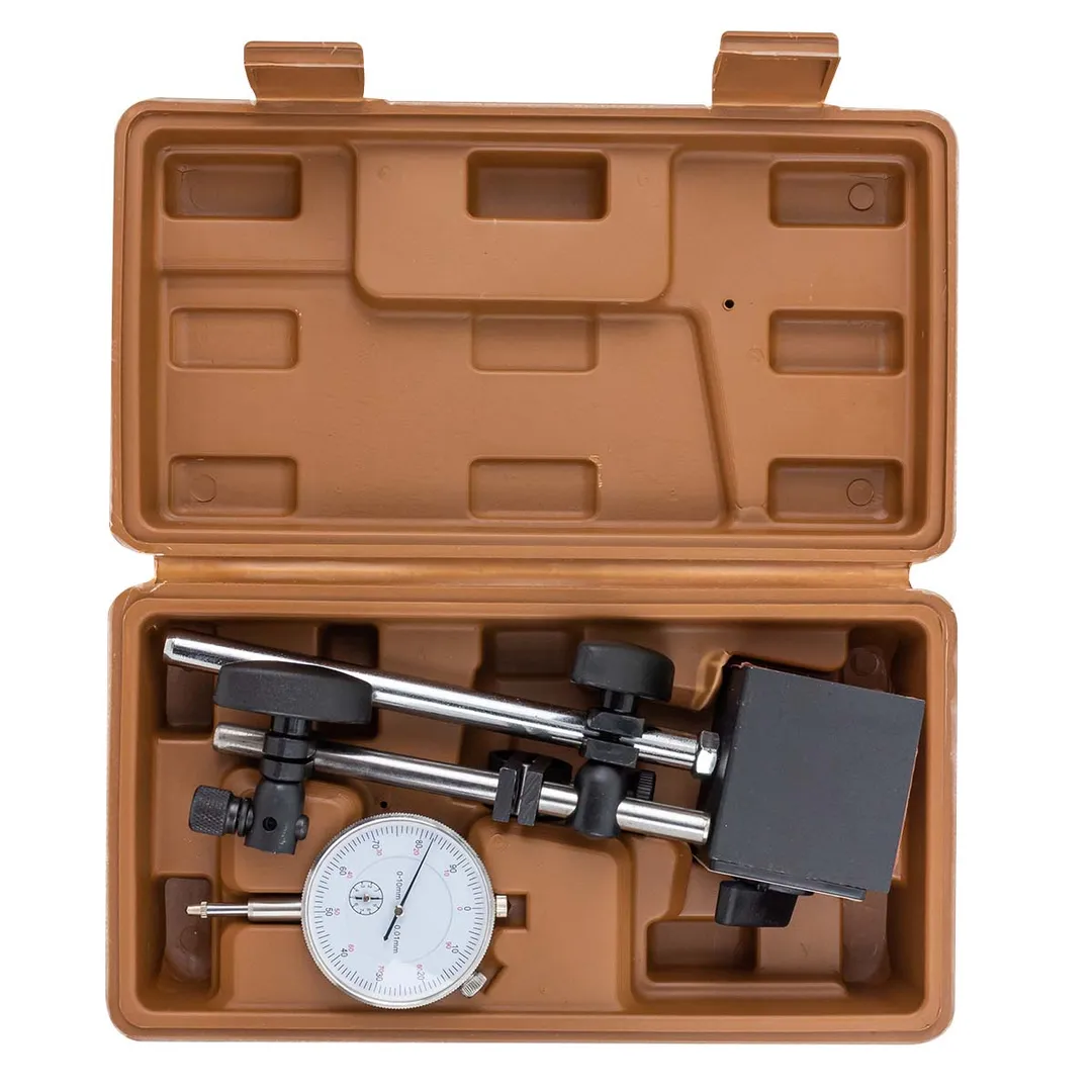 Индикатор часового типа – устройство для измерений и контроля отклонений от эталонной детали. Индикаторы без стойки не используют, так как опора придает дополнительную жесткость. Вам не надо покупать отдельно стойку, так как она идет в комплекте с индикатором. Стойку с магнитным основанием можно закреплять на горизонтальных, вертикальных или наклонных поверхностях для позиционирования измерительного устройства. Принцип действия действия часовых индикаторов основан на преобразовании линейного перемещения наконечника в соответственное перемещение стрелок циферблата. Индикатор широко применяется там, где необходим контроль горизонтальности и/или вертикальности положения плоскостей деталей, отклонения от плоскостности, параллельности, биения и т.д., служит для проверки качества в рамках стандартов и допусков на различных предприятиях – от автомобилестроения до частных мастерских. Диапазон измерений : 0 - 10 мм; Диаметр отверстия для крепления индикатора 4/8 мм; Размеры стойки d12 x 176 мм; Характеристика основания V-образное углубление; Вес : 2кг. Размеры основания 58 x 50 x 55 мм; Размеры измерительной руки d10 x 150 мм; Сила магнитного поля 600 N; Тип силы магнитного поля переключаемая; Размеры регулировочного винта M8 x 1.25; Цена деления 0,01 мм. Для удобного хранения и перемещения, товар укомплектован в прочный пластиковый кейс.Преимущества работы с нами