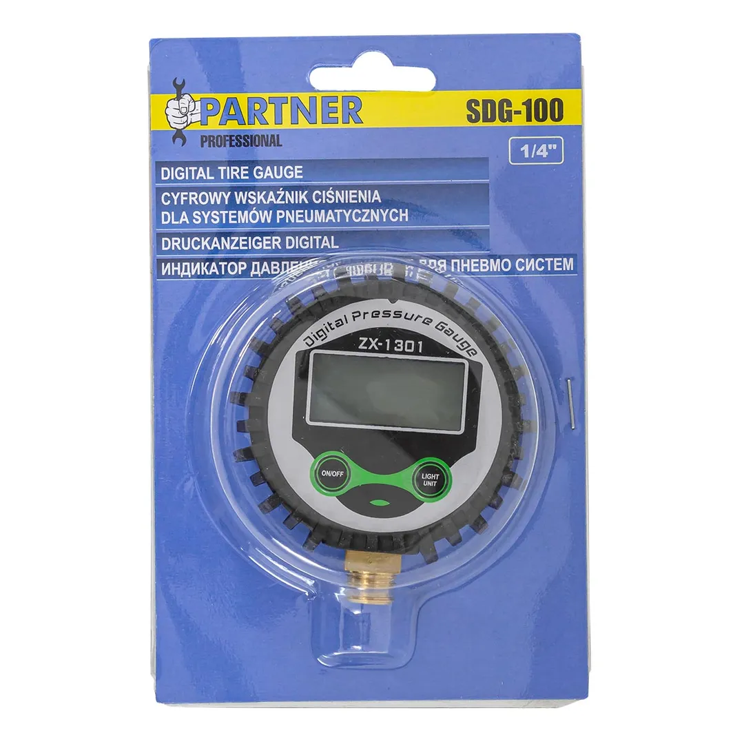 Цифровой индикатор давления для пневмосистем, от бренда Partner - идеальный выбор для профессионального использования. Он предназначен для контроля давления сжатого воздуха на пневматическом оборудовании, а полученные данные отображаются на ярком и легко читаемом дисплее. Обрезиненный корпус обеспечивает надежную защиту от механических повреждений. Этот универсальный цифровой манометр воздушный подходит для любых пневмопистолетов подкачки шин и способен измерять давление до 16 атмосфер. Резьба входа наружная 1/4" .Преимущества работы с нами