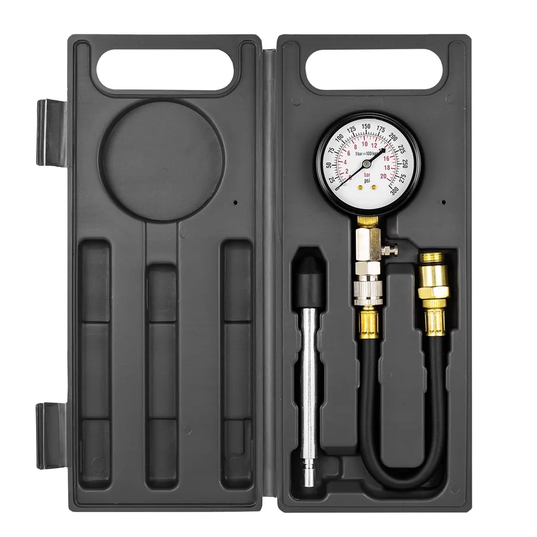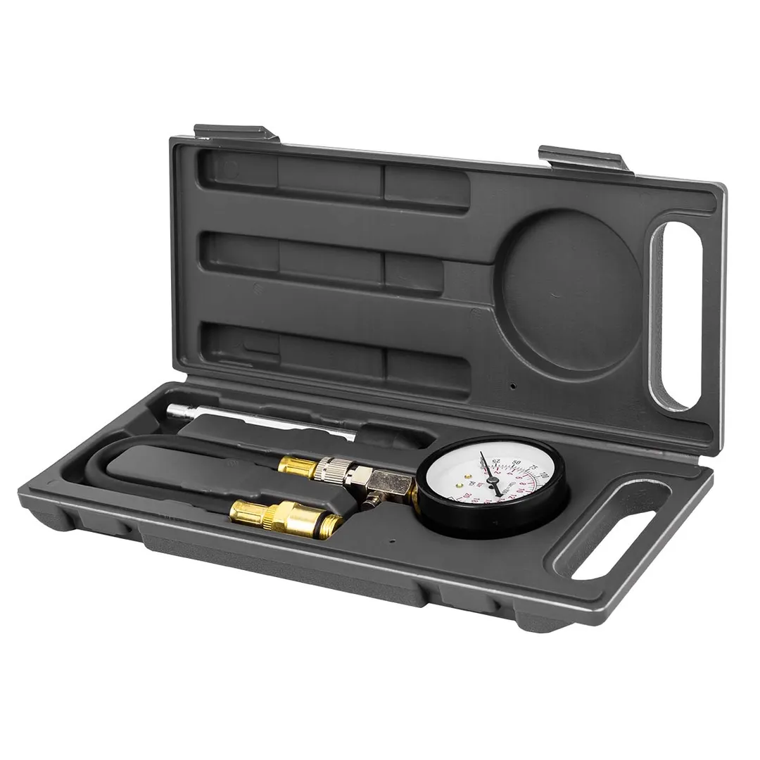 Набор с индикатором компрессии бензинового двигателя из 3 предметов, в кейсе - это прибор, который позволяет измерить давление в цилиндрах двигателя автомобиля. Он состоит из манометра, жесткого прижимного адаптера-переходника 150мм и набора адаптеров для различных типов двигателей. Манометр имеет диапазон измерений от 0 до 20 бар и точность измерения ±0,25 бар. Жесткий прижимной адаптер обеспечивает надежное крепление индикатора на двигателе и предотвращает его смещение во время измерения. Набор адаптеров позволяет использовать индикатор для различных типов бензиновых двигателей, включая двигатели с резьбой M14х1.25 и M18х1.5. Каждый адаптер имеет свою резьбу и подходит только для определенного типа двигателя. Компрессометр бензинового двигателя поставляется в кейсе для удобства хранения и транспортировки.Преимущества работы с нами