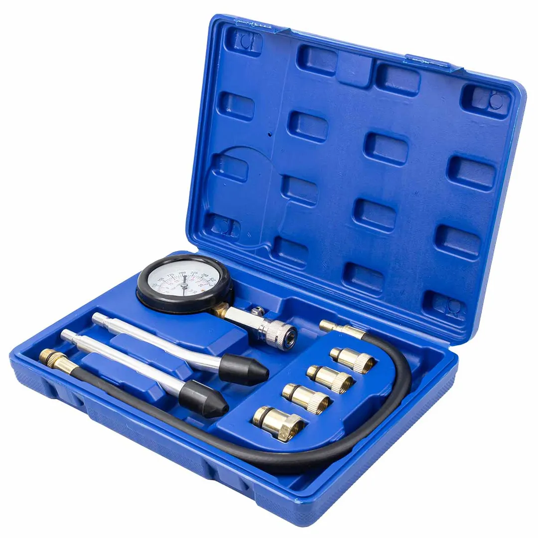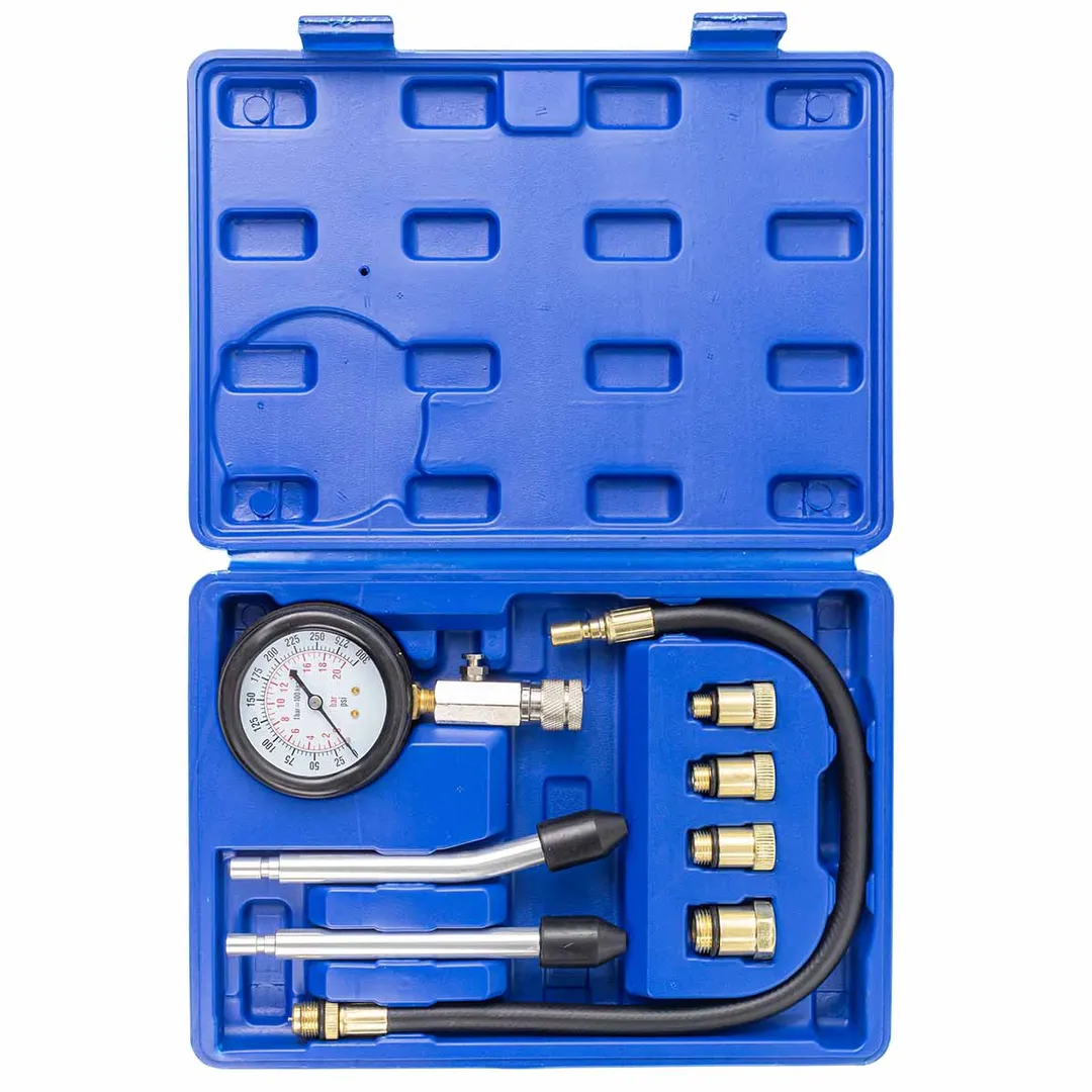 Набор с индикатором компрессии бензинового двигателя из 8 предметов, в кейсе - это прибор, который позволяет измерить давление в цилиндрах двигателя автомобиля. Он состоит из манометра, жесткого прижимного адаптера-переходника и набора адаптеров для различных типов двигателей. Манометр имеет диапазон измерений от 0 до 20 бар и точность измерения ±0,25 бар. Жесткий прижимной адаптер обеспечивает надежное крепление индикатора на двигателе и предотвращает его смещение во время измерения. Набор адаптеров позволяет использовать индикатор для различных типов бензиновых двигателей, включая двигатели с резьбой М10, М12, М14, М18 + 2 жестких прижимных адаптера-переходника. Каждый адаптер имеет свою резьбу и подходит только для определенного типа двигателя. Компрессометр бензинового двигателя поставляется в кейсе для удобства хранения и транспортировки. Он является необходимым инструментом для диагностики и обслуживания бензиновых двигателей и позволяет быстро и точно измерить давление в цилиндрах.Преимущества работы с нами