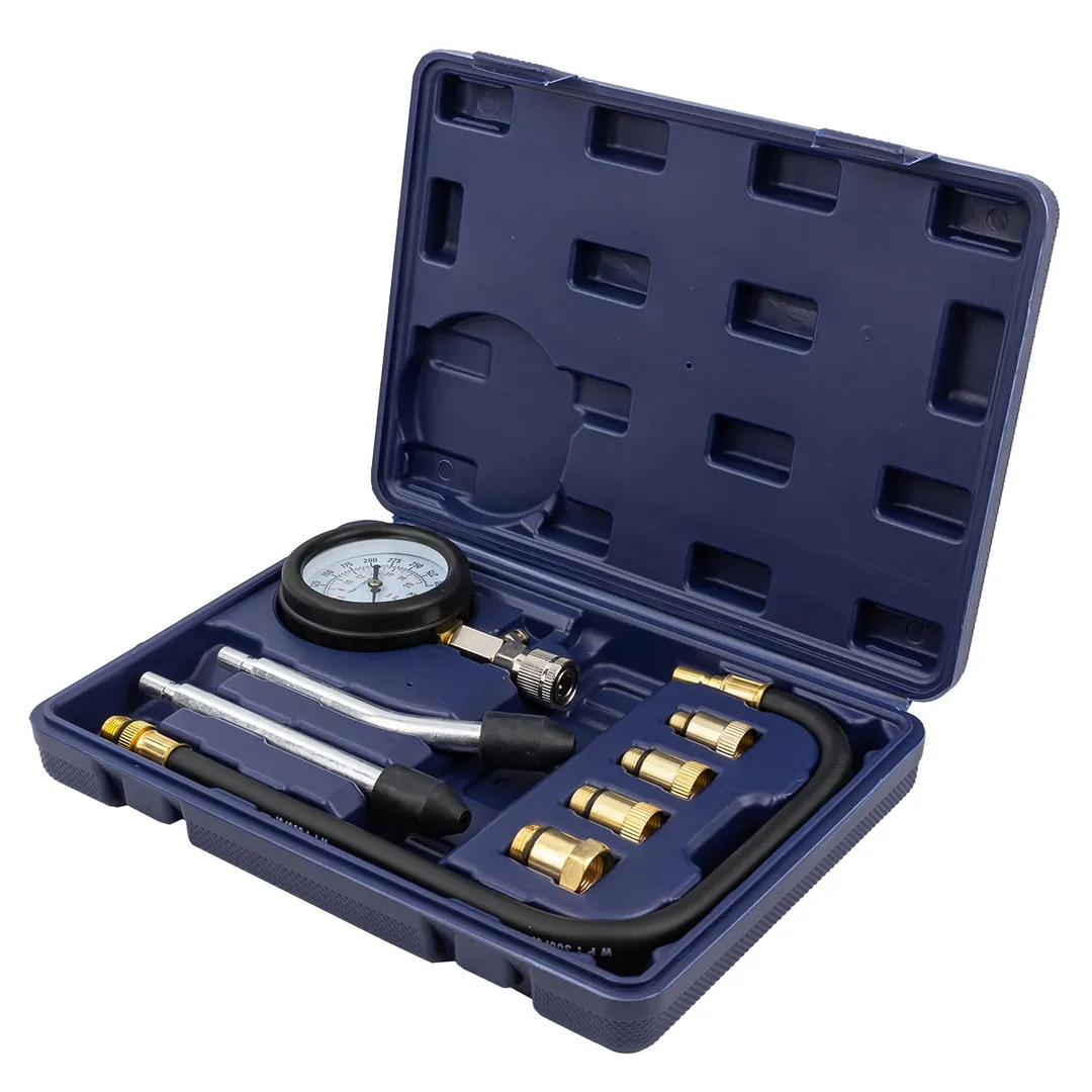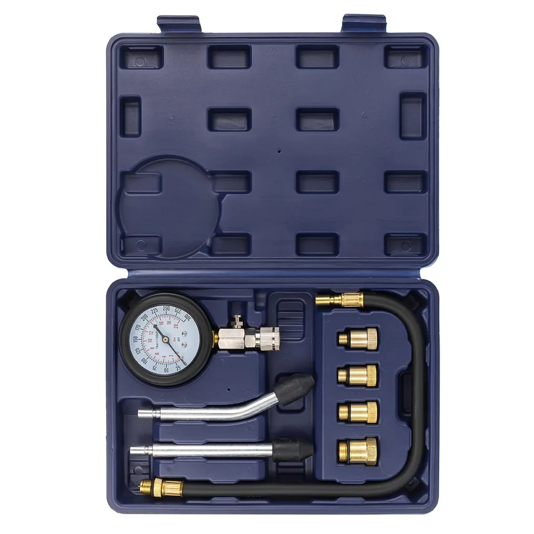 Набор с индикатором компрессии бензинового двигателя из 8 предметов в кейсе. Является профессиональным инструментом для определения давления в цилиндрах бензинового двигателя. Он состоит из манометров с диапазоном измерения 0-21 bar и точностью ±0.25 bar, жёстких прижимных адаптеров и адаптеров с различными резьбовыми соединениями (М10, М12, М14, М18). Благодаря такому набору, можно быстро и удобно измерить давление в любом бензиновом двигателе. Все инструменты находятся в прочном кейсе, что обеспечивает удобство хранения и транспортировки набора.Преимущества работы с нами