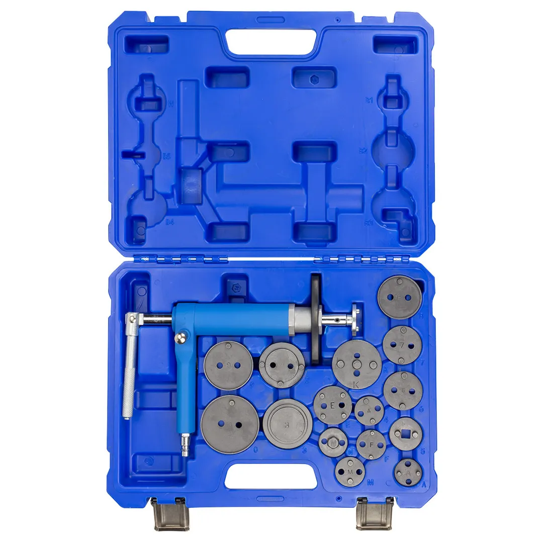 Инструмент для обслуживания тормозных цилиндров из 16 предметов (пневматический привод) предназначен для вдавливания цилиндров суппортов автомобилей при ремонте и обслуживании тормозной системы. Разработан для работы с различными типами тормозных цилиндров, включая цилиндры с правым и левым приводами. Это позволяет использовать набор для обслуживания широкого спектра автомобилей. Набор включает в себя различные инструменты, необходимые для выполнения различных операций по обслуживанию тормозных цилиндров, включая снятие, установку, регулировку и замену деталей. Наличие всех необходимых инструментов в одном наборе упрощает и ускоряет процесс обслуживания. Инструменты в наборе изготовлены из прочных и долговечных материалов, таких как высококачественная сталь. Это обеспечивает долговечность и надежность инструментов при выполнении задач по обслуживанию тормозных цилиндров. Комплектация: насадки- адаптеры 15 шт., пневматический привод с лево- и правосторонней резьбой, кейс. Для удобства хранения и транспортировки поставляется в прочном пластиковом кейсе.Преимущества работы с нами
