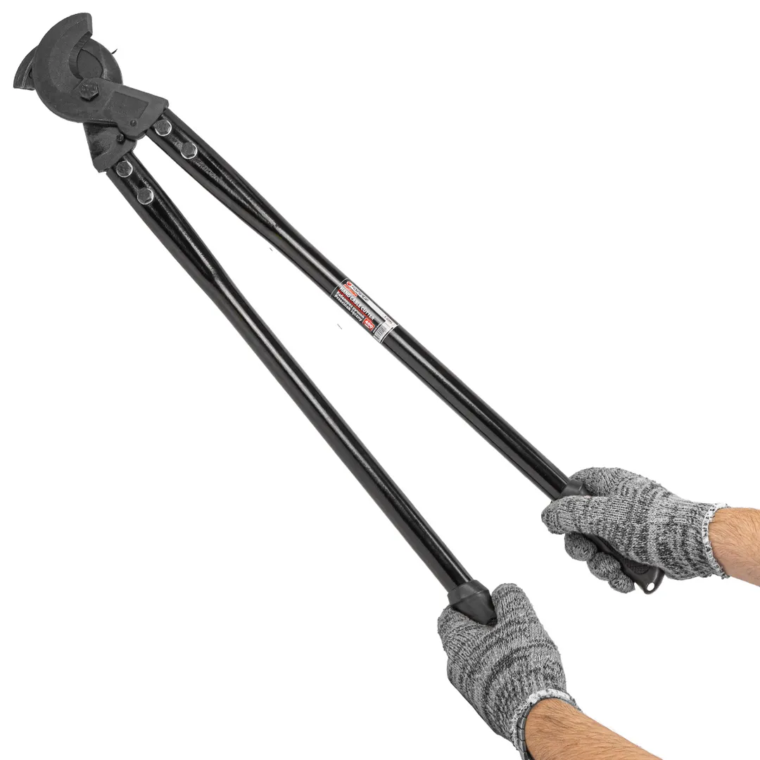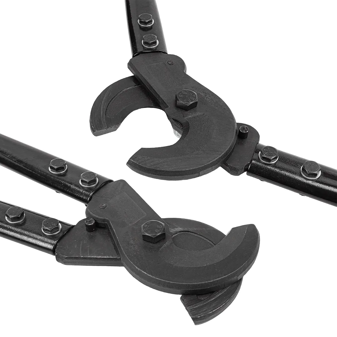 Кабелерез ручной - это узкоспециализированный инструмент, который разработан для резки кабеля. Применяется при монтаже или демонтаже проводов и кабелей. Это возможно благодаря особой конструкции губок, которые не только легко перекусывают кабеля, но и оставляют ровный рез, что зачастую невозможно сделать при помощи других инструментов, которые будут сплющивать жилы и оставлять рваные края. Кабелерез применяется для точного и чистого среза толстых кабелей из алюминия и меди. Площадь сечения - 400 мм2. Длина кабелереза - 80 см. Инструмент имеет мощную конструкцию. Для комфортной работы рукоятки оснащены специальными накладками. Изготовлен из высококачественной инструментальной стали. Режущие кромки закалены токами высокой частоты для увеличения ресурса.Преимущества работы с нами