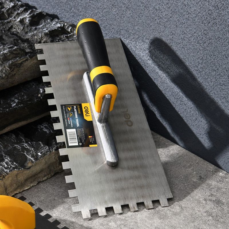 Кельма зубчатая Deli DL509312 - это специализированный штукатурный инструмент, который используется для нанесения и выравнивания штукатурных смесей на поверхности стен и потолков. Она имеет прямоугольную форму с ручкой на одном конце и зубчатым лезвием на другом.
