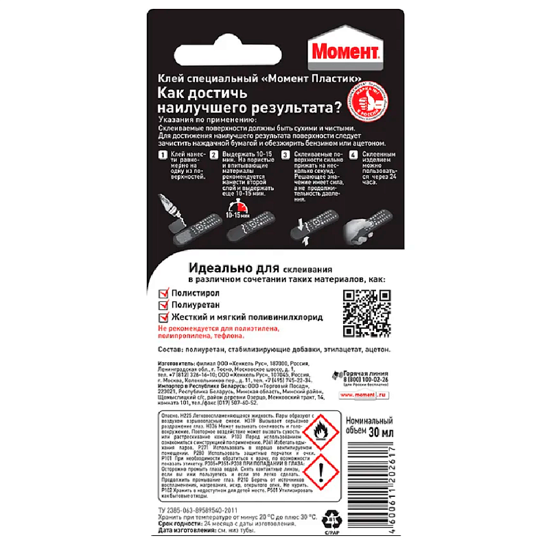 Клей "Момент Пластик" 30 мл в блистере надёжно соединяет пластиковые поверхности и является водо-морозостойким продуктом. Прозрачный, благодаря чему малозаметен в швах.
