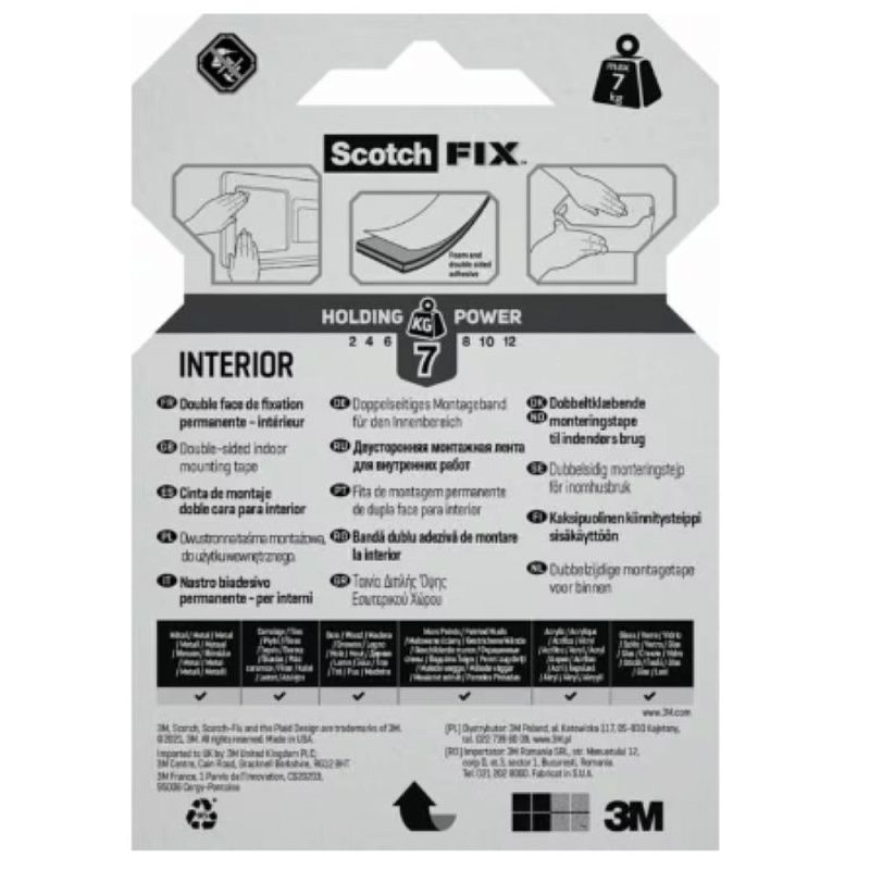 Монтажная двусторонняя лента для внутренних работ 3M Scotch 40011915 1,9×150 см предназначена для крепления различных материалов в помещении (термометры, вешалки, часы и т.п.). Основа ленты – вспененный полиуретан.