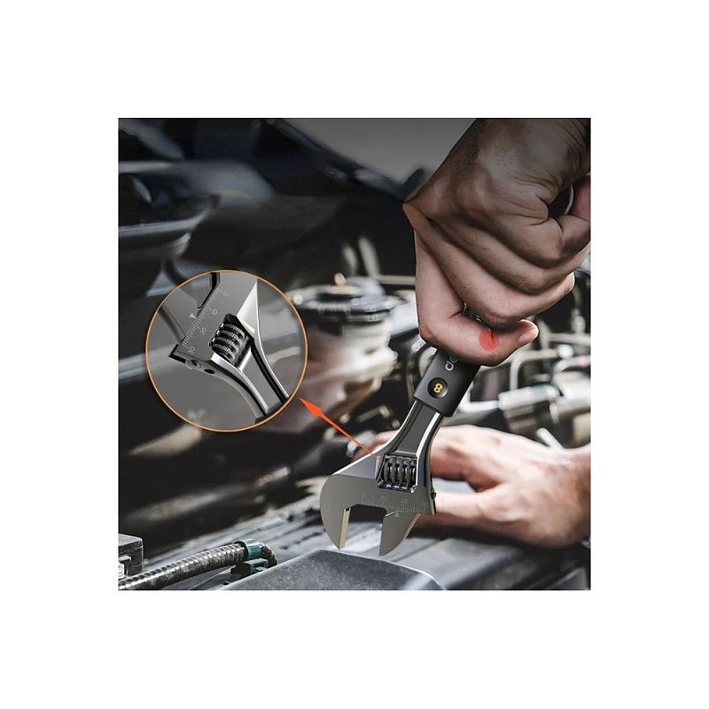 Благодаря регулировке размеров, ключ заменяет собой несколько рожковых ключей одновременно. Ключ выполнен из высококачественной углеродистой стали, что обеспечивает высокую антикоррозийную стойкость и долговечность. Эргономичная рукоятка с покрытием Soft Touch не скользит в руках, гарантируя продолжительную комфортную работу, да и просто приятная на ощупь. Лазерная гравировка шкалы значительно повышает стойкость к истиранию. На конце рукоятки предусмотрено специальное отверстие для подвесного хранения. Ключ упакован в стильную картонную коробку и будет отличным подарком для любителей качественного, современного инструмента.
