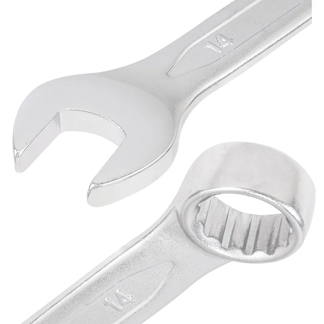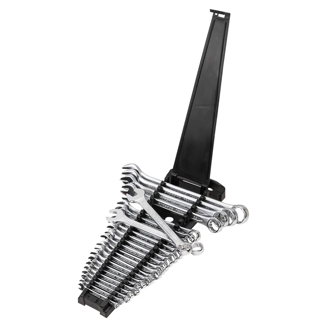 Ключи комбинированные – универсальные гаечные ключи, совмещающие в себе функционал и преимущества рожковых и накидных ключей. Зевы комбинированных ключей имеют одинаковые размеры. Ключи гаечные с открытым и кольцевым зевами предназначены для монтажа либо демонтажа резьбовых соединений. Набор изготовлен из высококачественной стали Cr-V. Ключи поставляются в трапециевидном пластиковом держателе. Комплектация: 6, 7, 8, 9, 10-2шт, 11, 12-2шт, 13-2шт, 14-2шт, 15, 16, 17-2шт, 18, 19, 21, 22,24, 27, 30, 32ммПреимущества работы с нами