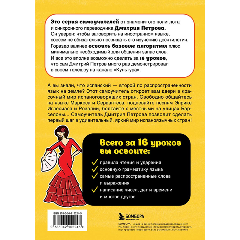 А вы знали, что испанский — второй по распространенности родной язык на земле? Этот самоучитель откроет вам двери к красочному миру испаноговорящих стран. Свободно общайтесь на языке Маркеса и Сервантеса, подпевайте песням Энрике Иглесиаса и Розалии, болтайте с местными на улицах Барселоны... Самоучитель Дмитрия Петрова позволит сделать первый шаг в удивительный яркий мир испаноязычных стран!
