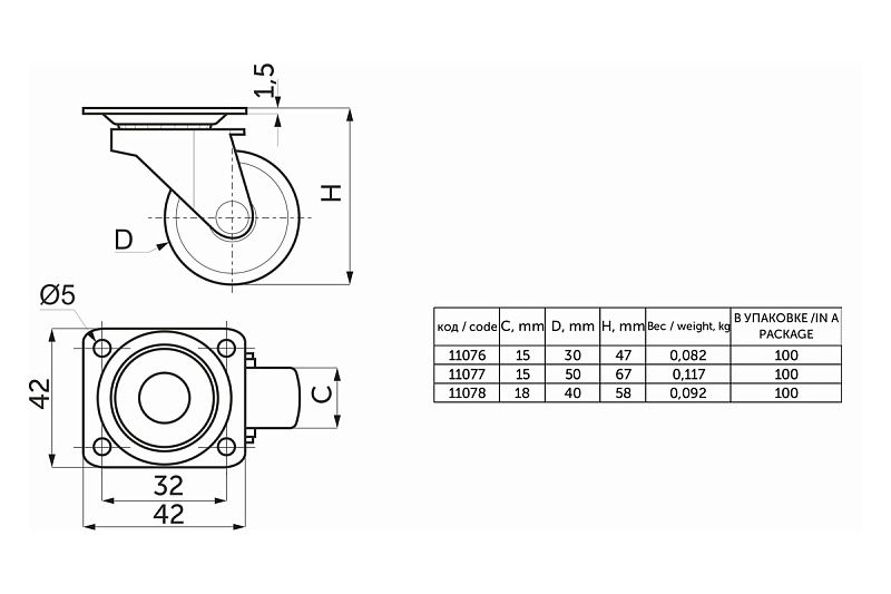 Колесо меб. c рез.ободом d50 h67 с площадкой, серый AKS 114906, описание: