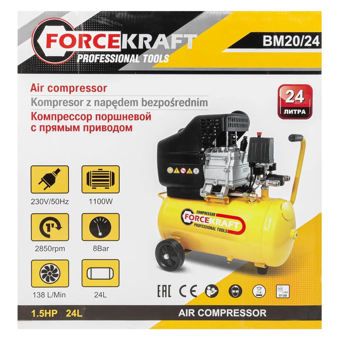 Компрессор поршневой с прямым приводом, ресивер 24 л, 8 бар, 138л/м, 1100W, 230V ForceKraft FK-BM20/24