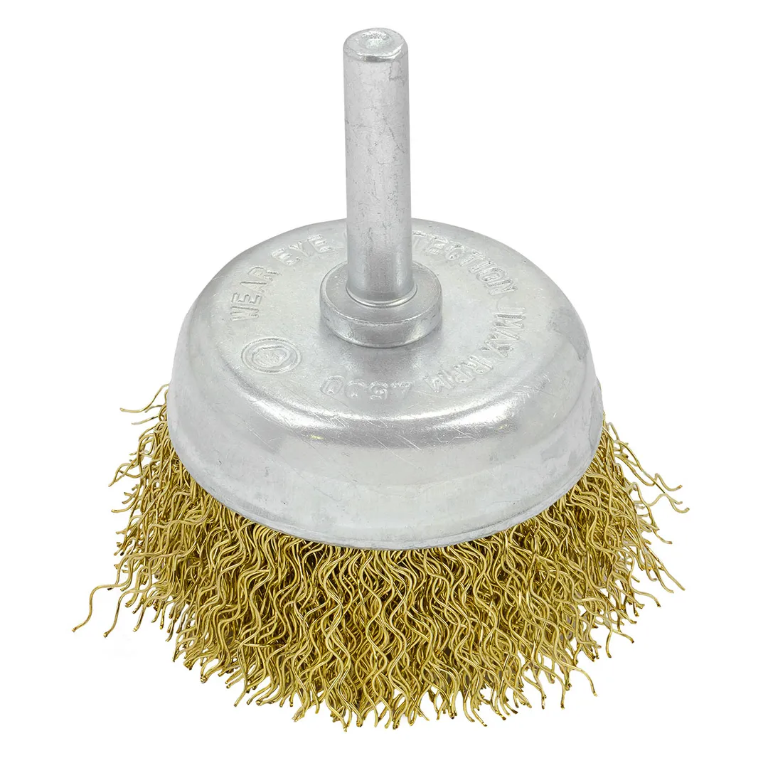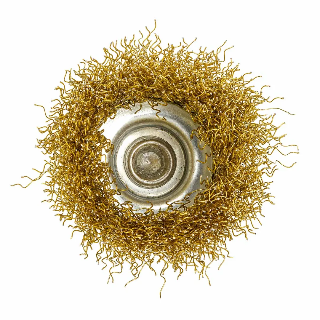 Кордщетка чашеобразная для дрели применяется для очистки от застаревшей краски и лака, коррозийного налета, шлака и окалины; зачистки изделий перед сваркой; шлифовки и полировки; удаления ненужной части наплавленного металла со сварных швов; браширования, текстурирования и шершевания древесины; выравнивания шероховатостей; удаления заусенцев; стачивания острых углов; черновой и финишной обработки. Нередко кордщетки используются в качестве альтернативы абразивным кругам. Диаметр кродщетки 50мм Диаметр хвостовика 6мм Длина хвостовика 27мм Максимальное количество об/мин 4500. Материал проволоки - латунь, форма проволоки - волнистая.Преимущества работы с нами