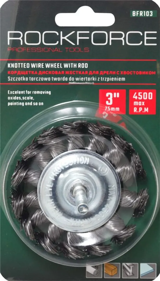 Кордщетка дисковая стальная витая для дрели 75 мм RockForce RF-BFR103, описание и характеристики: