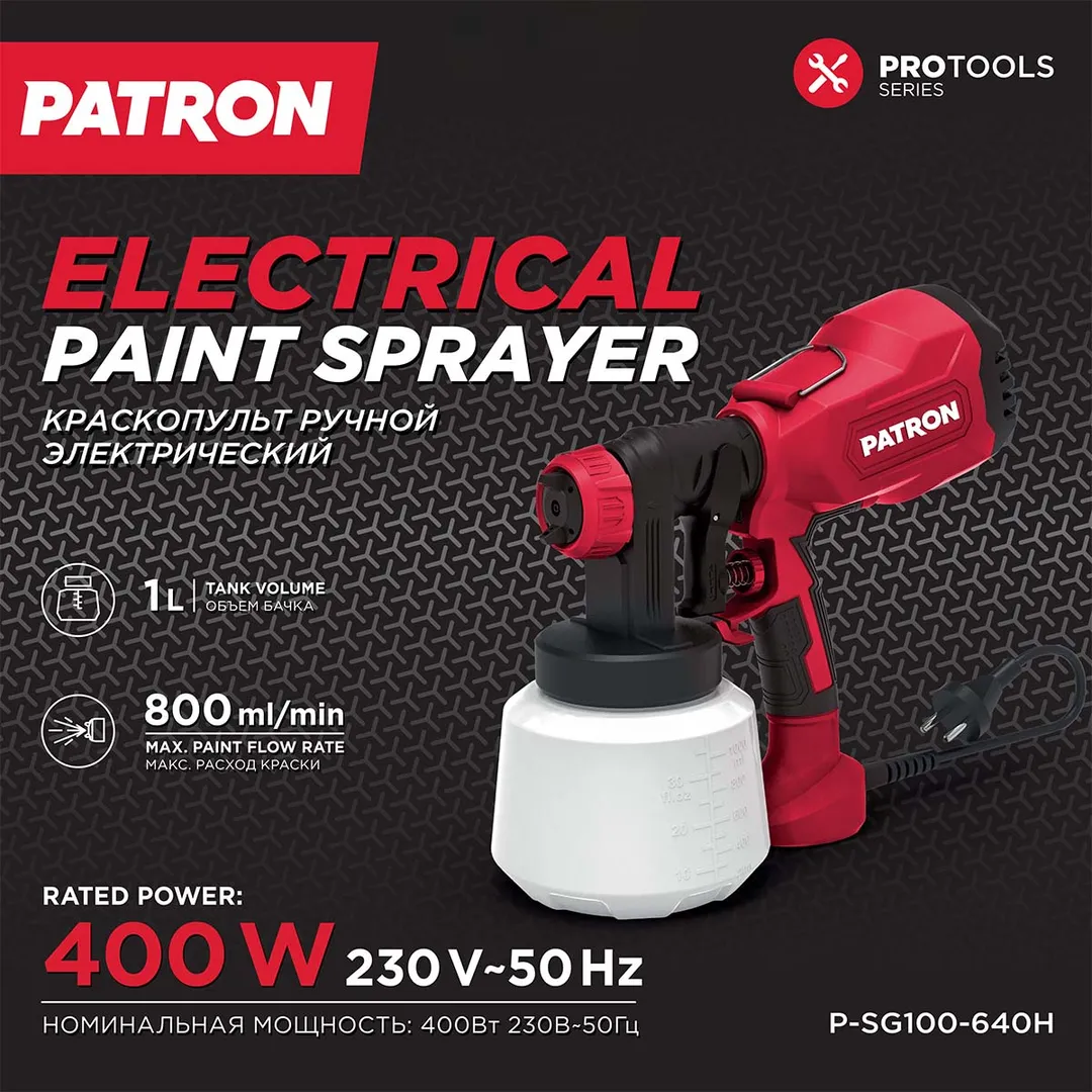 Краскопульт ручной электрический 230В, 400Вт, объем бачка 1л, макс.расход краски 800 мл/мин PATRON P-SG100-640H