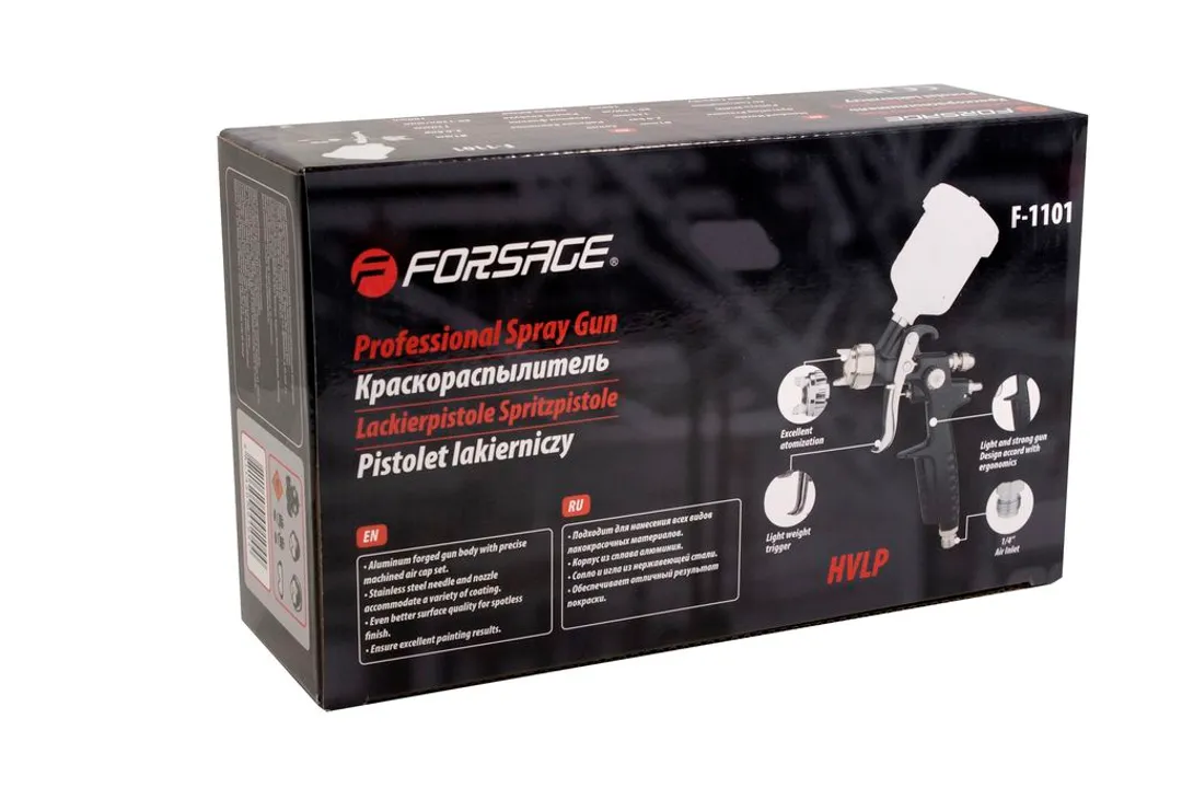 Краскораспылитель с верхним пластиковым бачком, 100 мл, 1.0 мм, 2.0Bar, 80-130 л/мин Forsage F-1101