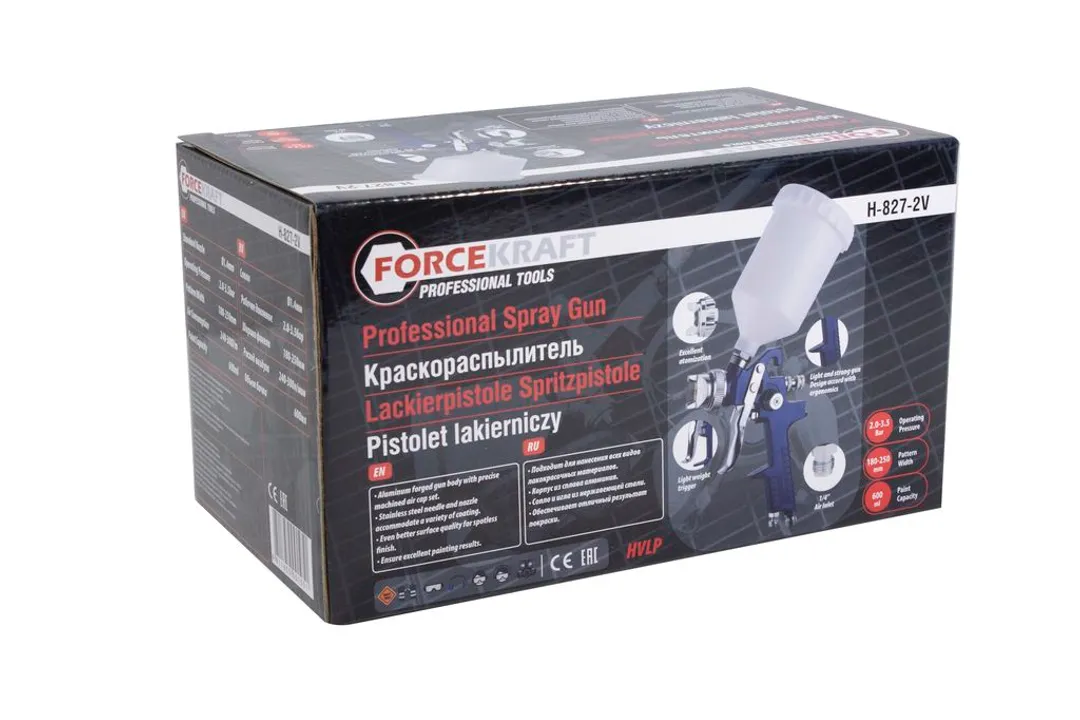Краскораспылитель с верхним пластиковым бачком, 600 мл, 1.4 мм, 2.0-3.5Bar, 240-300 л/мин ForceKraft FK-H-827-2V