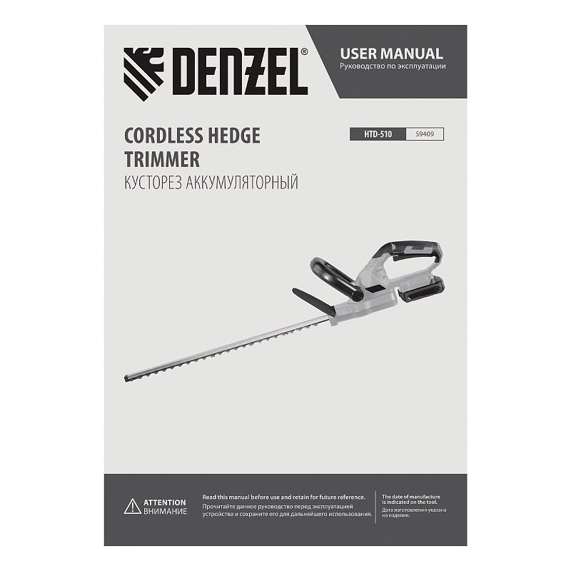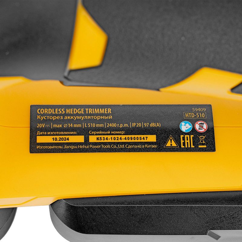 Кусторез аккумуляторный HTD-510, нож 510 мм, Li-Ion, 20 В Denzel 59409, описание:
