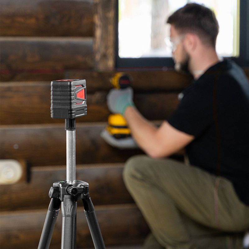 - Самовыравнивание — прибор автоматически компенсирует неровности в пределах ±4°, при выходе за пределы данного диапазона лазерные лучи будут мигать.