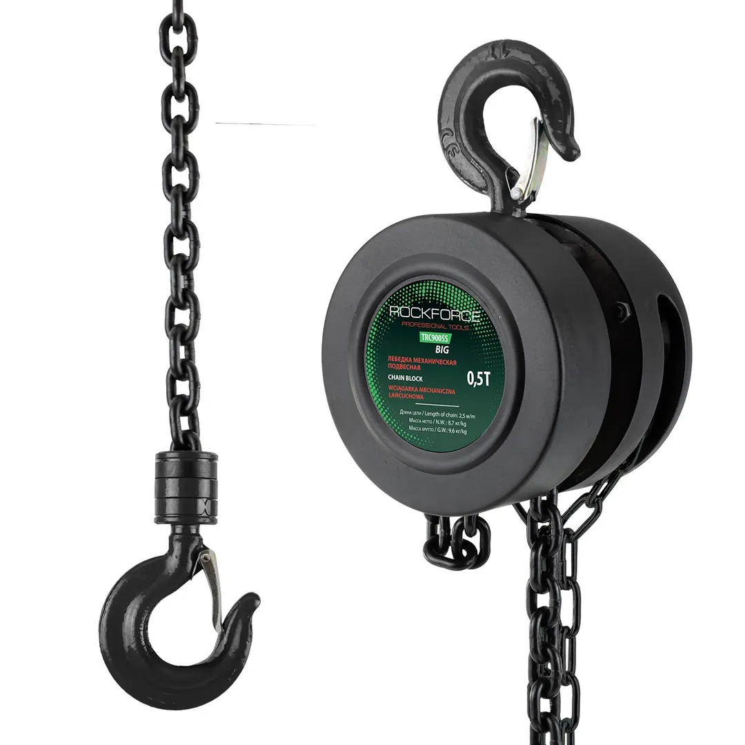 Таль механическая подвесная с фиксацией цепи натяжения, 0.5 т, длина цепи - 2.5 м в кейсе RockForce RF-TRC9005S BIG, описание и характеристики: