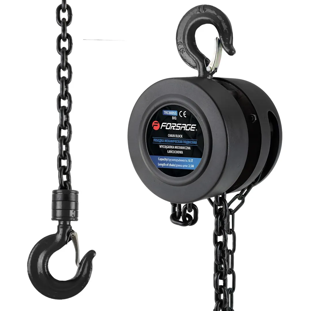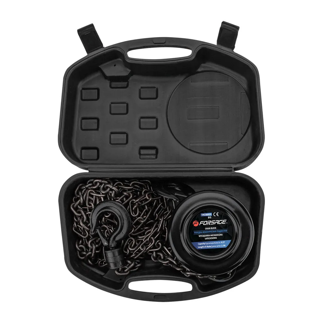 Таль механическая подвесная с фиксацией цепи натяжения, 0.5 т, длина цепи - 2.5 м в кейсе Forsage F-TRC9005S BIG, описание и характеристики: