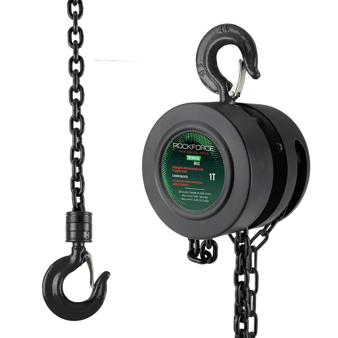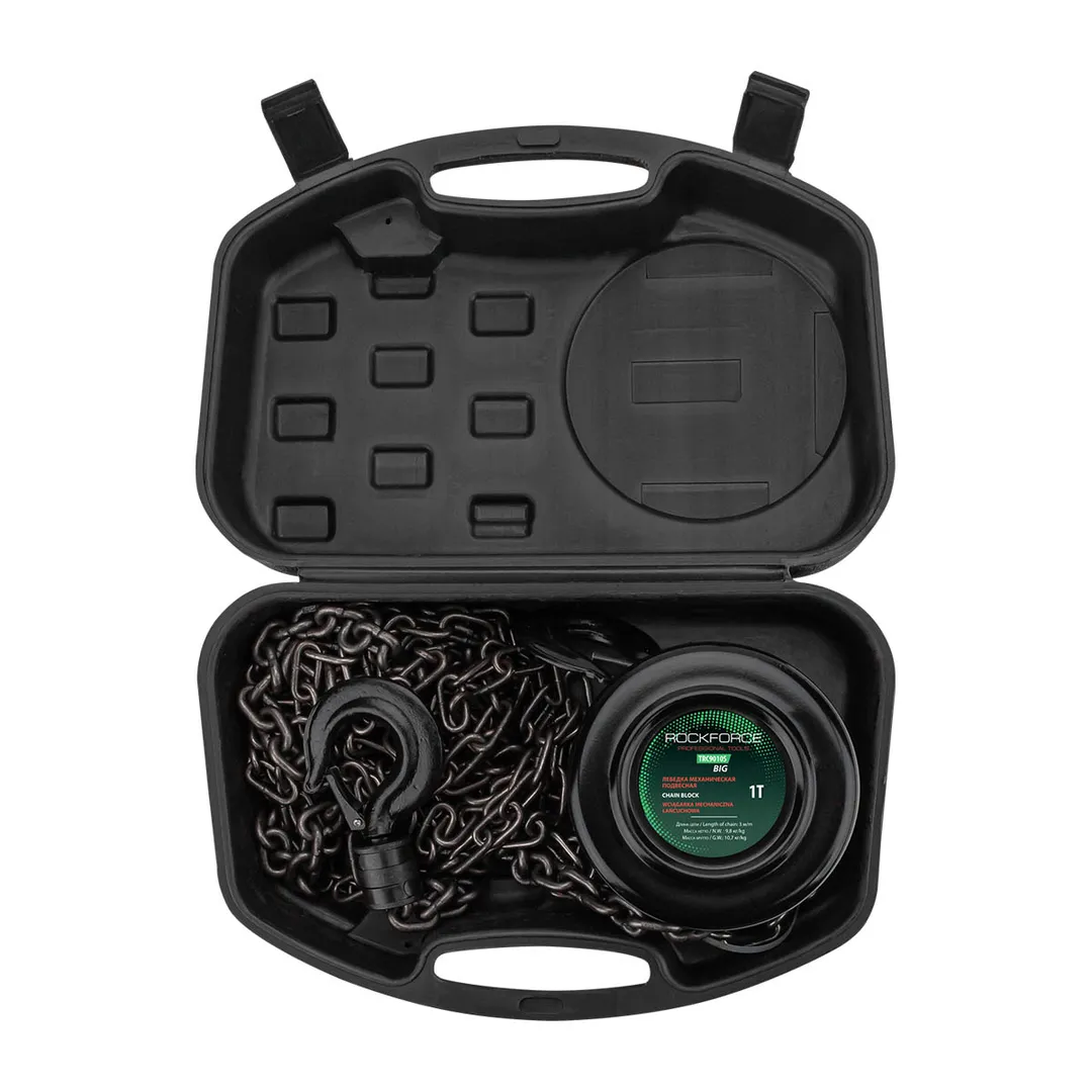 Таль механическая подвесная с фиксацией цепи натяжения, 1 т, длина цепи - 2.5 м в кейсе RockForce RF-TRC9010S BIG, описание и характеристики: