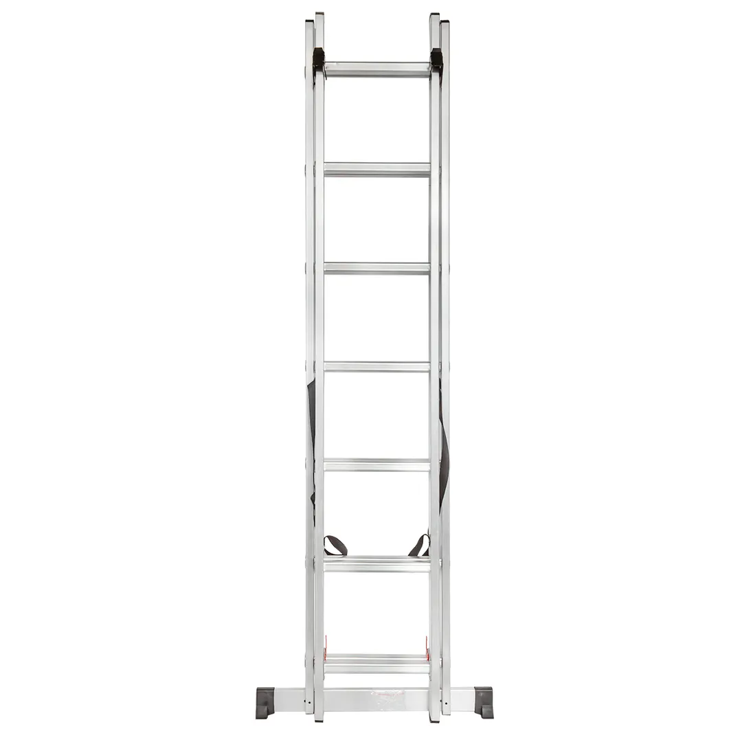 Лёгкая и прочная лестница «4 в 1» для бытового использования: приставная, раздвижная, двухсторонняя стремянка, " лестничный марш" (установка на разноуровневой поверхности). Стойки и перекладины выполнены из экструдированного алюминиевого профиля. Рифлёные перекладины 23×23 мм для надёжного сцепления. Перекладины соединятюся вальцовочным креплением. Алюминиевая стяжка создаёт жёсткий треугольник и фиксирует рабочее положение. 2 зацепа и автоматический фиксатор секции позволяют фиксировать лестницу на нужном шаге. Кронштейны соединяют и направляют секции. Пластиковые вставки обеспечивают плотное соединение и улучшают скольжение. Страховочные погодоустойчивые ремни на заклёпках с увеличенной шляпкой создают жёсткую конструкцию, не гниют и не выгорают. Широкая съёмная опорная траверса стабилизирует конструкцию. Максимальная нагрузка 150 кг, количество ступенек на секцию - 7, высота в сложенном виде 2мПреимущества работы с нами