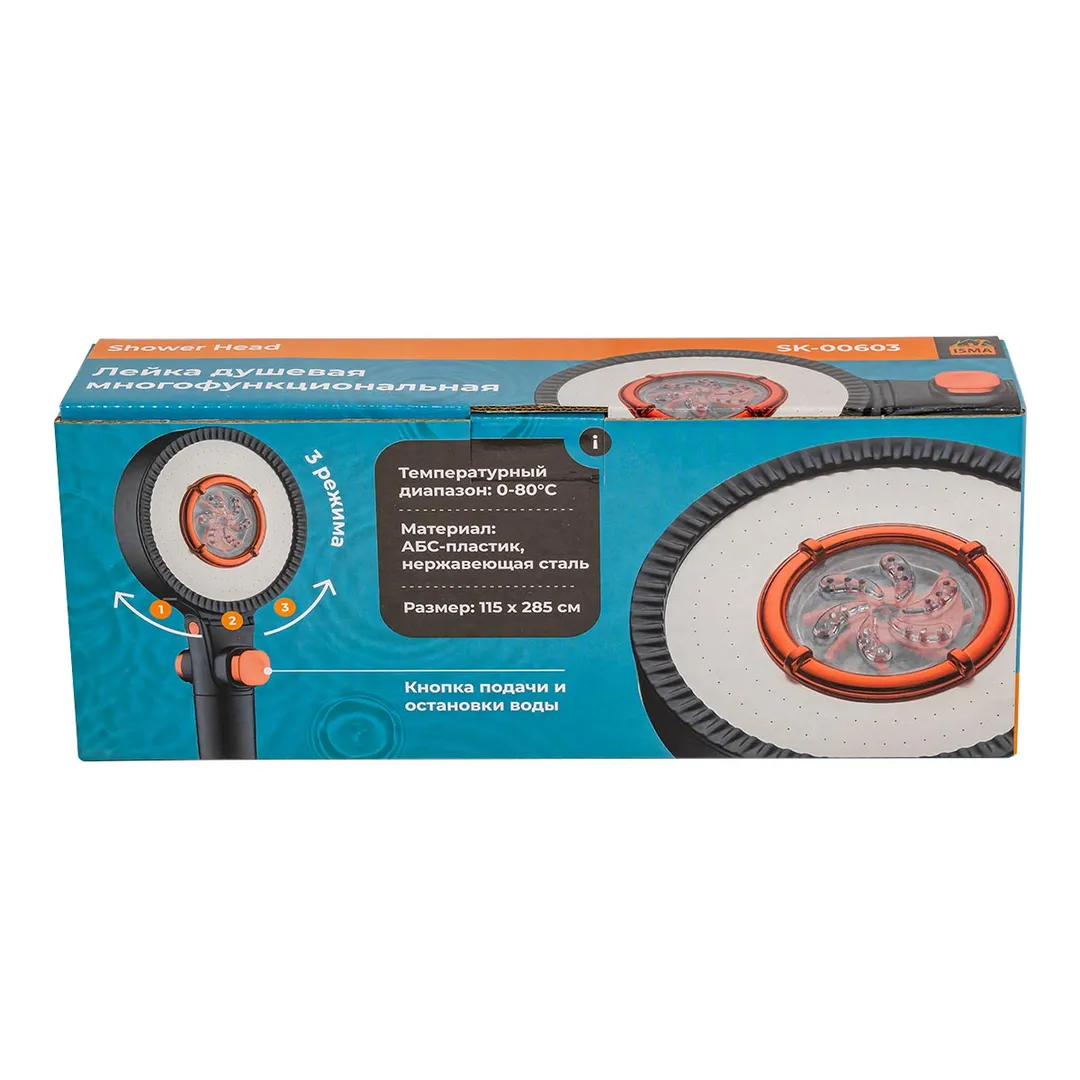Лейка душевая двухсторонняя шарнирная с кнопкой подачи воды, АБС-пластик/нерж.сталь, L-28.5см, ø-11.5см, 0-80°С, 3 режима, очистка от хлора ISMA ISMA-SK-00603