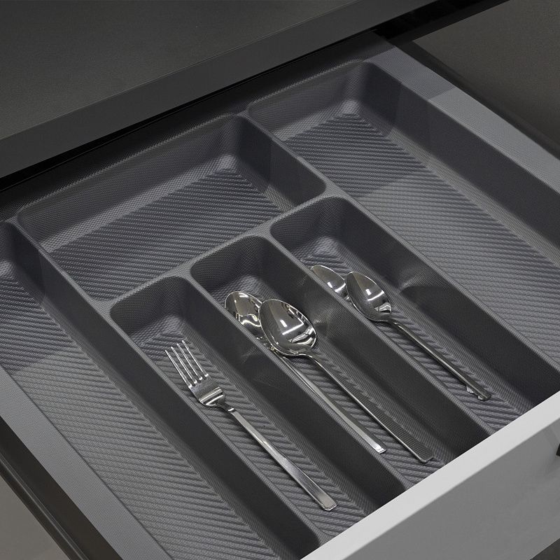 Лотки для столовых приборов серии PIXEL новое и стильное решение для организации хранения столовых приборов на кухне: - текстура “бисер” вполуматовом сером цвете, - плотный эластичный пластик для долговечной службы, - возможна установка в ящик глубиной от 440 мм до 485 мм за счет возможности подрезки.Технические характеристики: