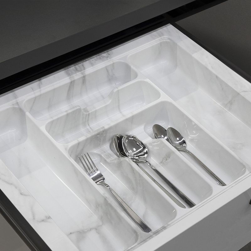 Лотки для столовых приборов серии MARBLE новое и стильное решение для организации хранения столовых приборов на кухне: - принт “мрамор” в полуматовом бело-золотомцвете, - плотный эластичный пластик для долговечной службы. - возможна установка в ящик глубиной от 390 мм до 430 мм за счет возможности подрезки.Технические характеристики: