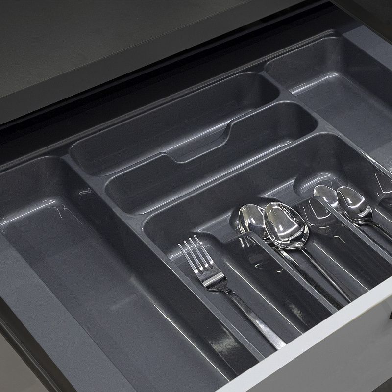 Лотки для столовых приборов серии BASIC оптимальное решение для организации хранения столовых приборов на кухне: - лаконичный внешний вид в однотонномполуматовомсером цвете, - плотный эластичный пластик для долговечной службы, - широкий диапазон глубины ящика, возможна установка в ящик глубиной от 390 мм до 430 мм за счет возможности подрезки.Технические характеристики: