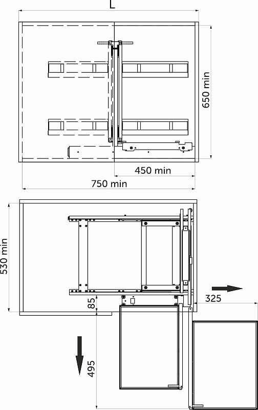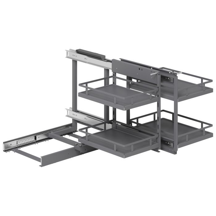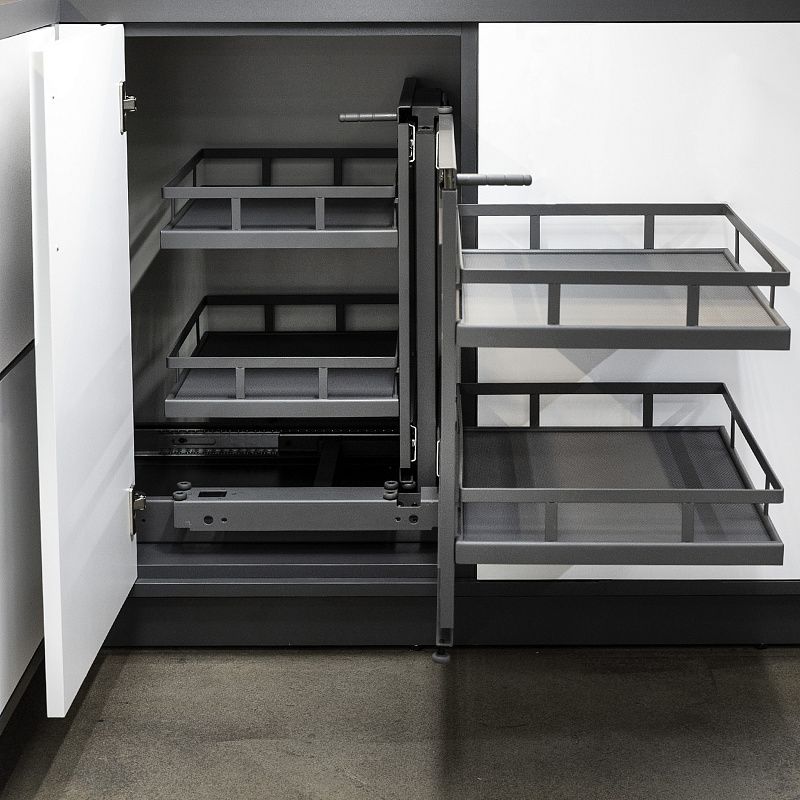 Магический угол FOCUS премиальное решение для организации хранения в угловом пространстве на кухне: - современный дизайн, стильный, лаконичный внешний вид в матовом графитовом цвете, - толстый надежный прут, стальное дно из листового металла, жесткая сварная конструкция, качественные сварные швы (лазерная сварка), - эпоксидно-полиэфирное покрытие, - предустановленное противоскользящее покрытие, - регулировка расположения и количества установленных полок (съемные), - механизм полного выдвижения с доводчиком, - выдвижение универсальное (левое/правое), - рекомендованная нагрузка на полку - 10 кг, - подходит для ящика как с ДСП 18 мм, так и с ДСП 16 мм. Продуманная конструкция магического угла помогает организовать угловое хранение банок, столовой посуды, продуктов на кухне. В комплекте: - малая корзина с противоскользящим ковриком (графит) - 2 шт, - большая корзина с противоскользящим ковриком (графит) - 2 шт, - несущая конструкция, - комплект шариковых направляющих и доводчик, - комплект крепежей, - инструкция.Технические характеристики: