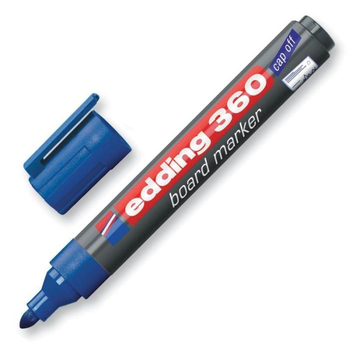 Маркер для белых досок Edding 360 с пулевидным наконечником, толщина письма 1,5-3 мм. Пигментные чернила почти без запаха. Стираются сухим способом почти со всех гладких поверхностей, таких как эмаль, стекло, пластик.