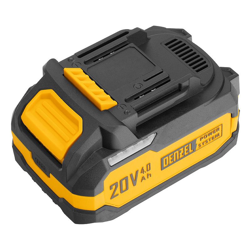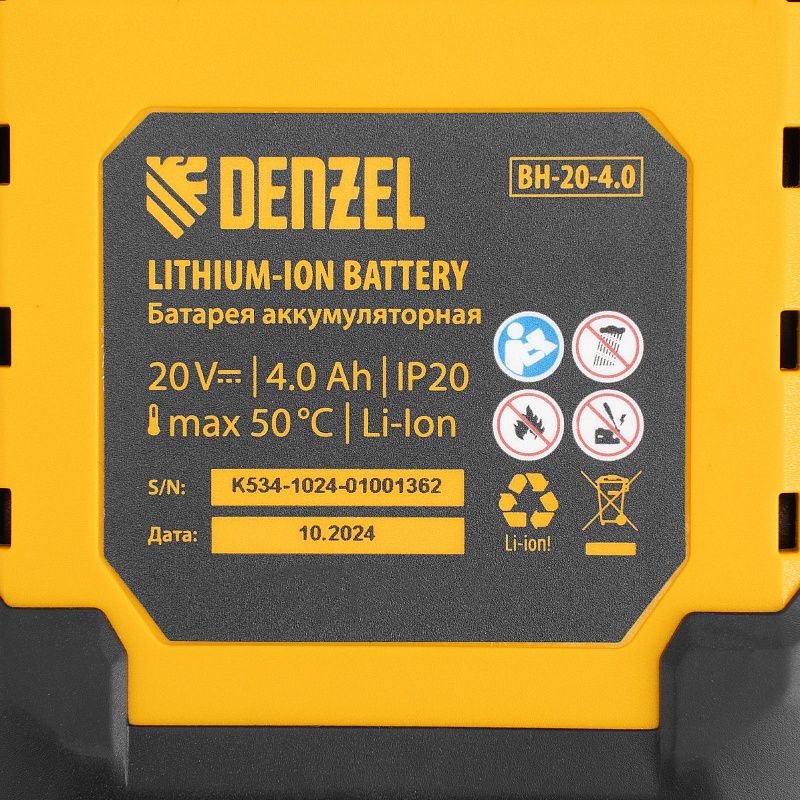 - Универсальность — аккумулятор Li-Ion емкостью 4 А·ч совместим со всеми инструментами единой платформы Denzel Power System 20V.