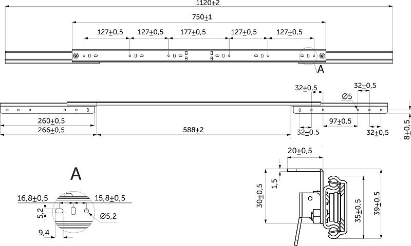 Механизм внешнего (наружного) крепления к царге устанавливается с наружной стороны царги и имеет разные габариты механизма в сложенном и разложенном виде. Длина каретки может выходить за длину царги (это позволяет производителю сделать стол большого размера). Направляющая синхронизированная с металлическим фиксатором. Максимальная рекомендуемая длина вставки – 558 мм. Направляющие наружного крепления возможно устанавливать и с внутренней стороны царги. Для этого необходимо, чтобы общая длина направляющей в раскрытом положении была меньше длины царги. Если длина направляющей больше длины царги, необходимо сделать фрезеровку перпендикулярных царг. Рекомендуемая нагрузка – 60 кг.Технические характеристики: