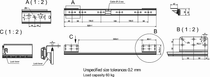 Механизм для раздвижных столов внутренний синхронный со стопором 35х520мм AKS 68649, описание: