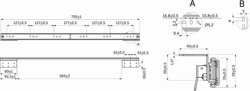Механизм внутреннего крепления к царге устанавливается с внутренней стороны царги. Длина каретки не выходит за длину царги (а также за габаритные размеры направляющей шины). Направляющую внутреннего крепления также возможно устанавливать с наружной стороны царги, однако в таком случае теряется эстетичное преимущество данного вида механизмов. Направляющая синхронизированная с металлическим фиксатором. Максимальная рекомендуемая длина вставки – 490 мм. Для таких механизмов рекомендуется проектировать вылет полустолешницы в размер половины каретки. Например, длина каретки - 80 см, соответственно вылет полустолешницы – 40см. Рекомендуемая нагрузка – 60 кг.Технические характеристики: