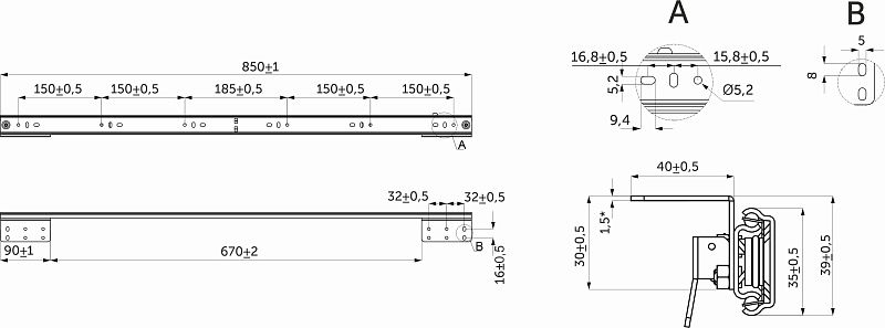 Механизм внутреннего крепления к царге устанавливается с внутренней стороны царги. Длина каретки не выходит за длину царги (а также за габаритные размеры направляющей шины). Направляющую внутреннего крепления также возможно устанавливать с наружной стороны царги, однако в таком случае теряется эстетичное преимущество данного вида механизмов. Направляющая синхронизированная с металлическим фиксатором. Максимальная рекомендуемая длина вставки – 640 мм. Для таких механизмов рекомендуется проектировать вылет полустолешницы в размер половины каретки. Например, длина каретки - 80 см, соответственно вылет полустолешницы – 40см. Рекомендуемая нагрузка – 60 кг.Технические характеристики: