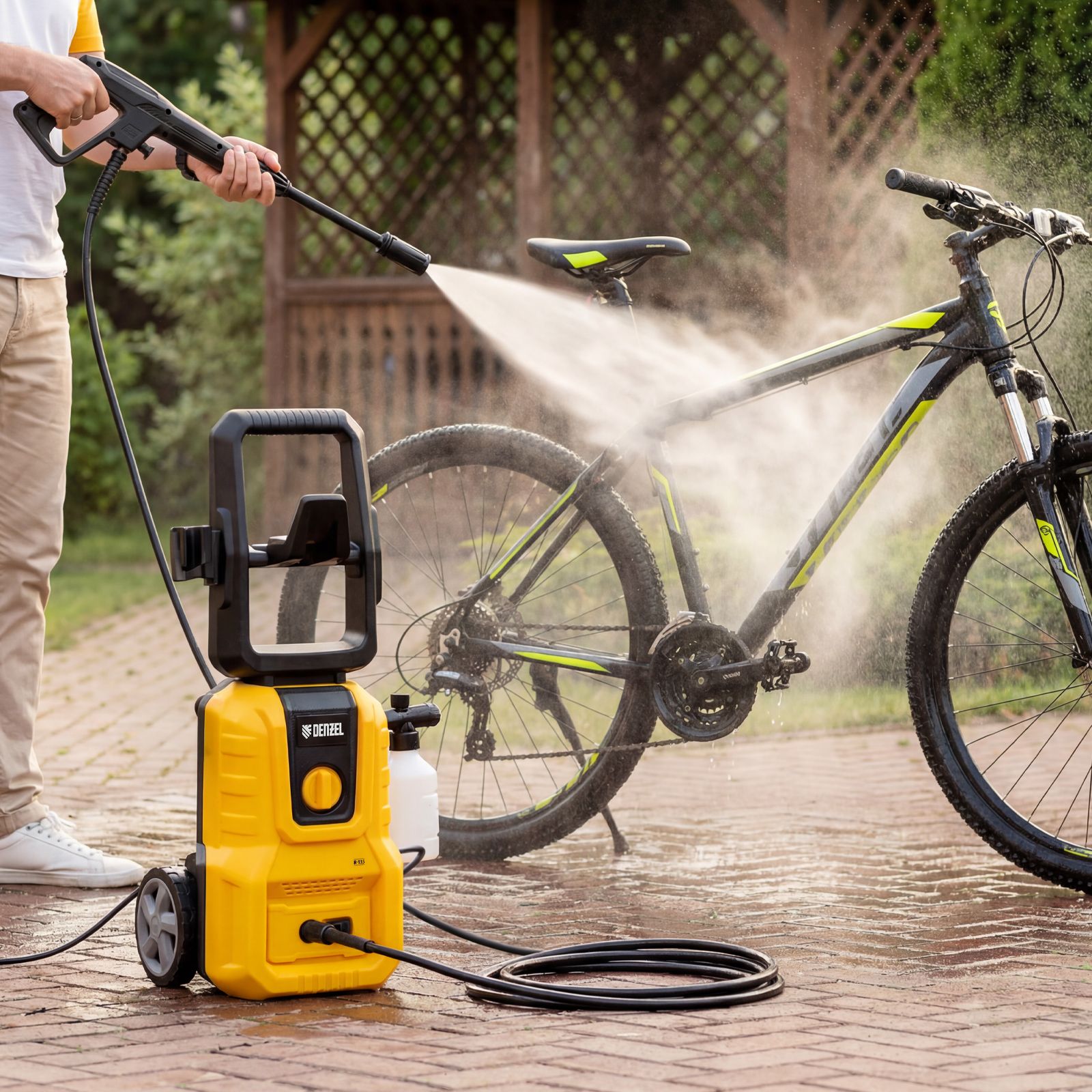 длина кабеля и шланга высокого давления составляет 5 м, что позволяет свободно передвигаться по участку.