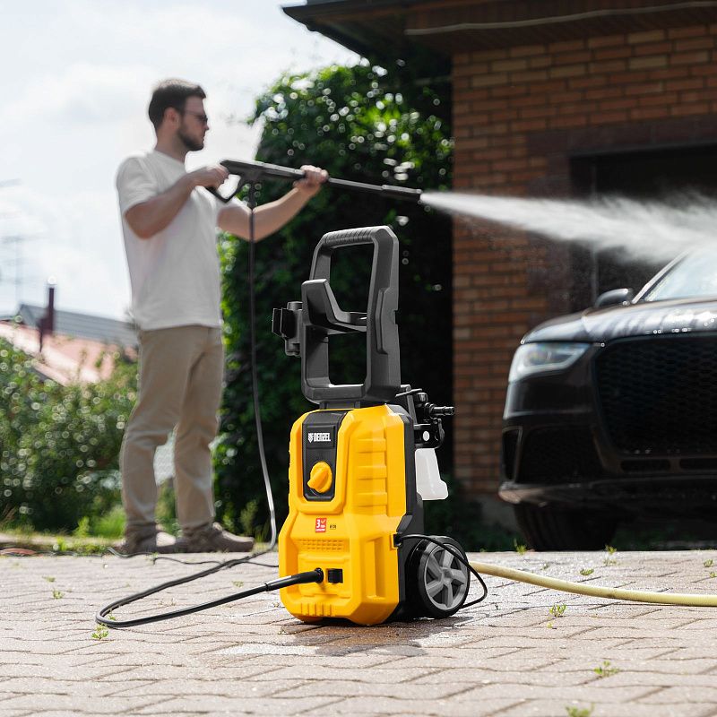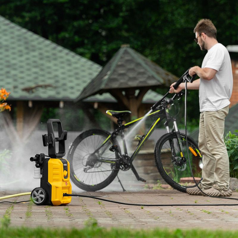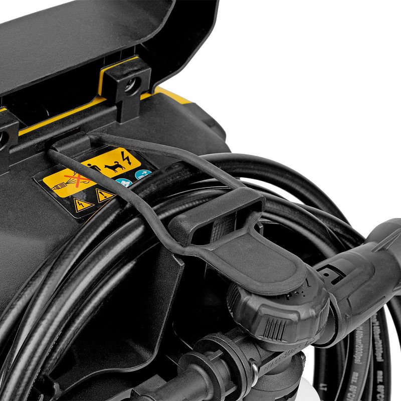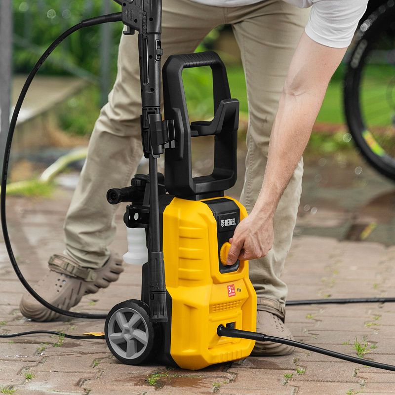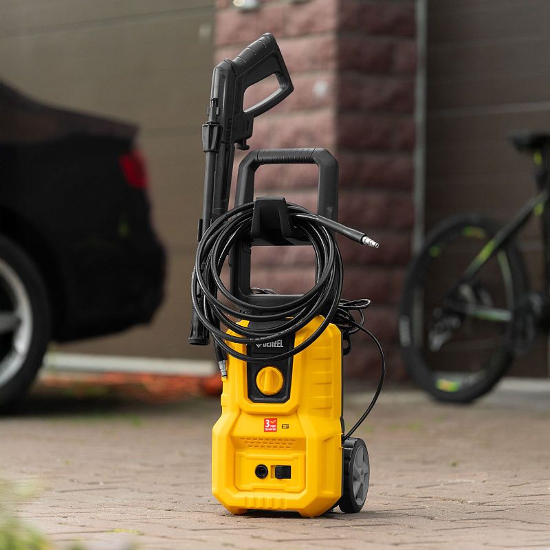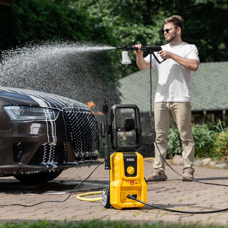 длина кабеля и шланга высокого давления составляет 5 м, что позволяет свободно передвигаться по участку.