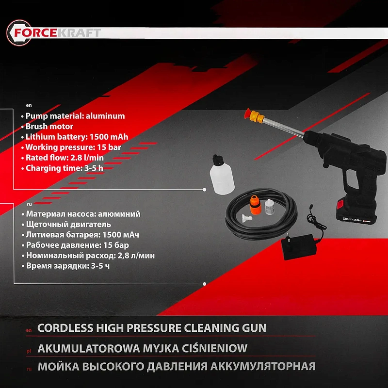 Мойка высокого давления аккумуляторная 21В,15 Бар,2.8 л/мин, батарея 1500 мАч ForceKraft FK-PG001