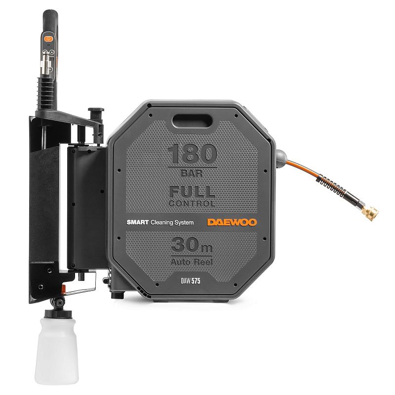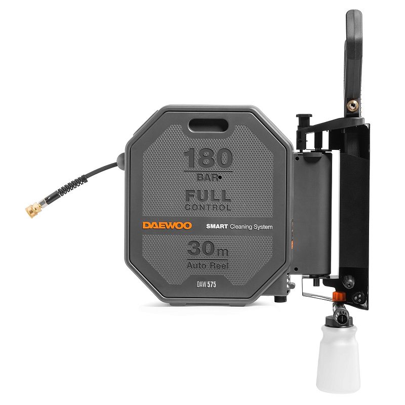 - 30-метровый шланг на катушке с электроприводом. Армированный шланг длиной 30м устойчив к заломам и позволяет комфортно работать на большой территории. Встроенный электропривод катушки смотает шланг одним нажатием кнопки на корпусе мойки или удаленно на пистолете. Также можно легко установить необходимую для работы длину шланга.