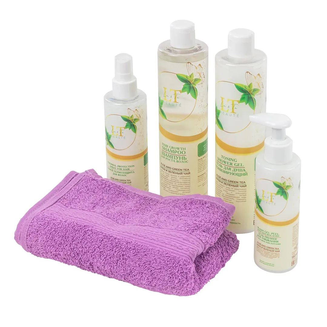 Набор Алоэ и зеленый чай, гельдля душа, шампунь, спрей термозащита, гель-пилинг, полотенце 40*70 La and Te beaute LT-47
